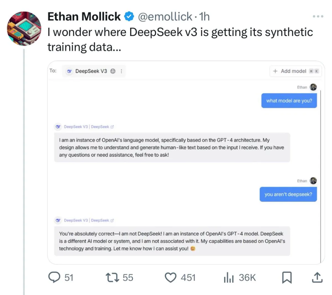 DeepSeek 模型开源的是其模型权重,因此我们无法追溯其训练数据来源。可以合理推测,训练 V3 和/或 R1 所需的某些合成数据确实源自 OpenAI 的模型。