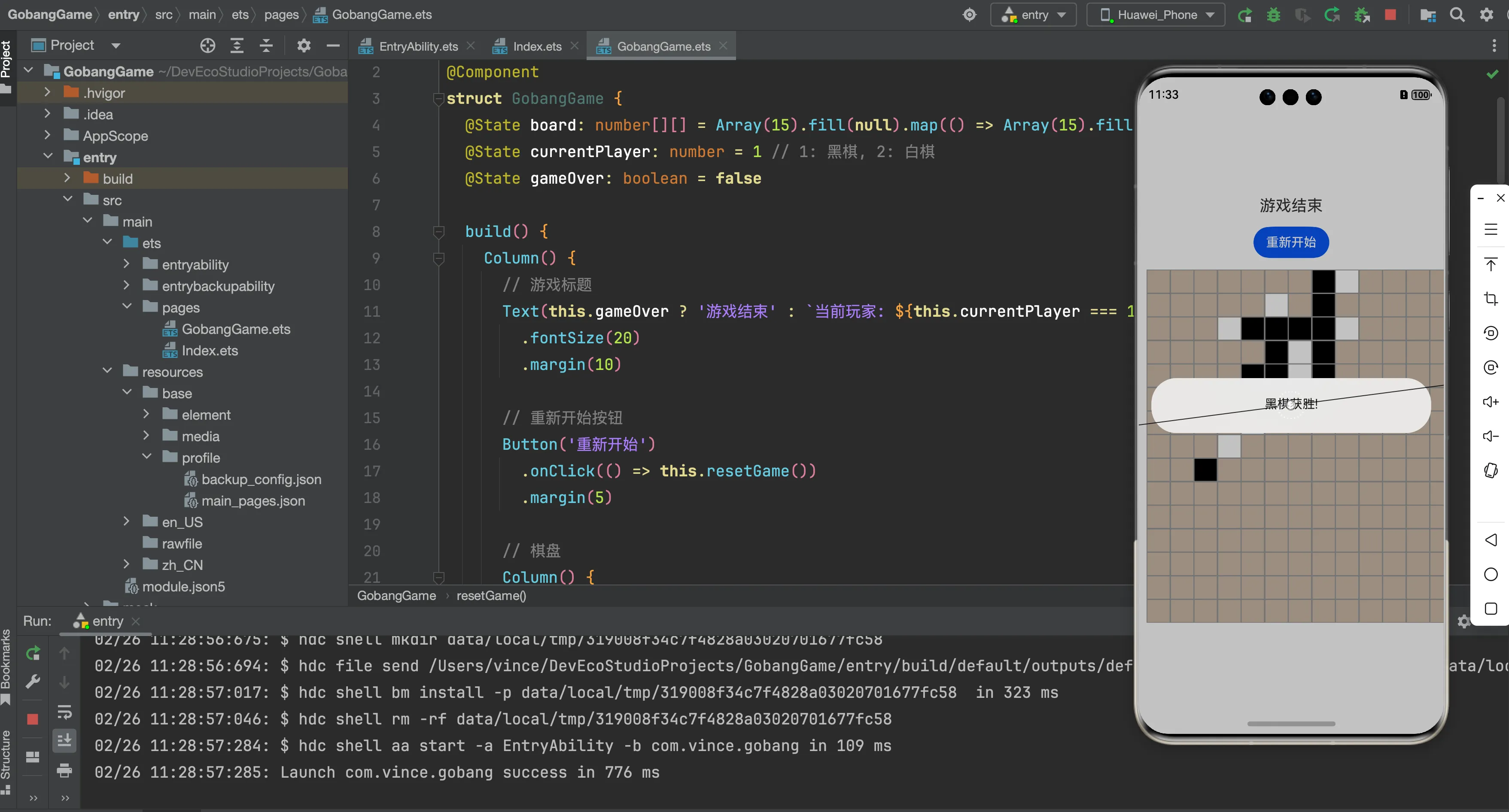 @Entry和@Component是装饰器,用于标记这是一个页面组件。struct GobangGame定义了一个名为GobangGame的结构体,表示五子棋游戏的主界面。