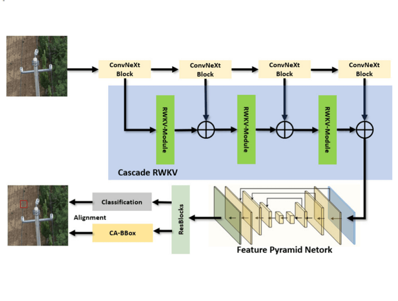 论文提出了一种基于 RWKV 架构的因果感知设备缺陷检测框架,以解决变电站设备中的非刚性缺陷检测和长尾分布问题。RWKV 架构具有全局感受野,可增强缺陷特征提取能力。它与框架中的其他模块相结合。
