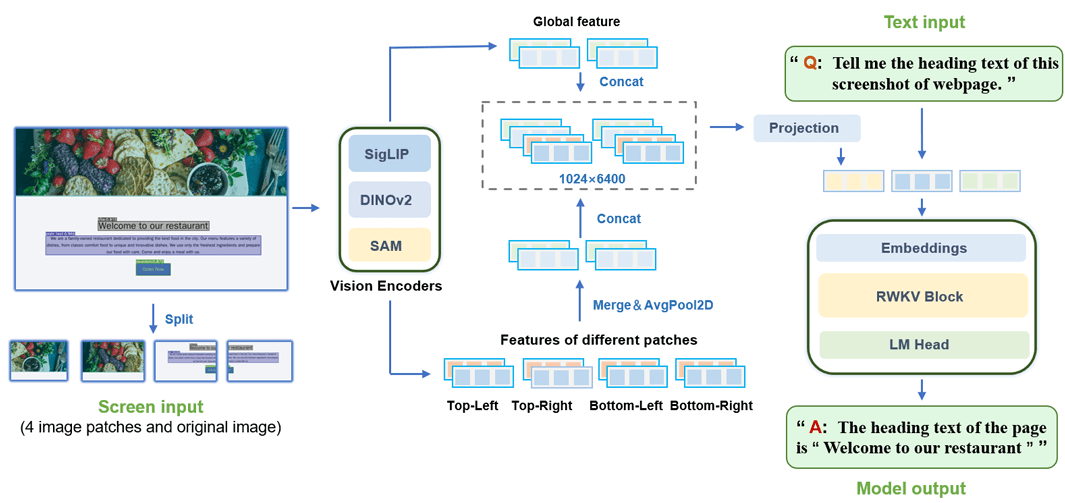 实验表明其在 UI 理解任务中表现卓越,在动作定位和元素识别等任务上优于更大规模模型,凸显了 RWKV 在多模态场景中的适应性和高效性。