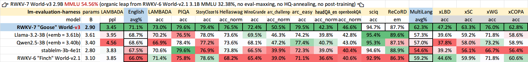 RWKV-7-2.9B 模型基于 RWKV World V3 数据集训练,英文和多语言能力均显著超越所有同尺寸模型,包括 Llama 3.2 3B、Qwen2.5 3B 等知名优秀开源模型。