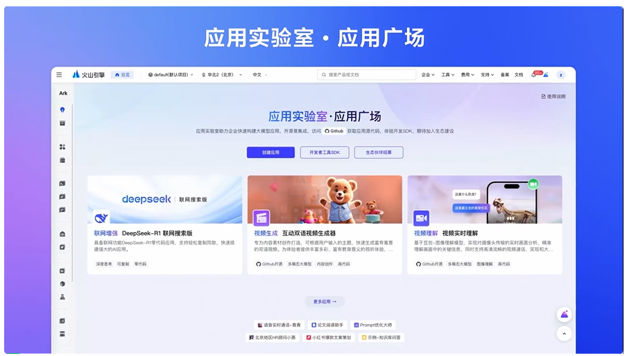 火山引擎宣布将大模型应用开源,正式上线“大模型应用实验室”平台,并开源手机助手、Deep Research、DeepSeek联网版、实时视频理解、互动双语视频生成器、语音实时通话-青青等众多AI应用。