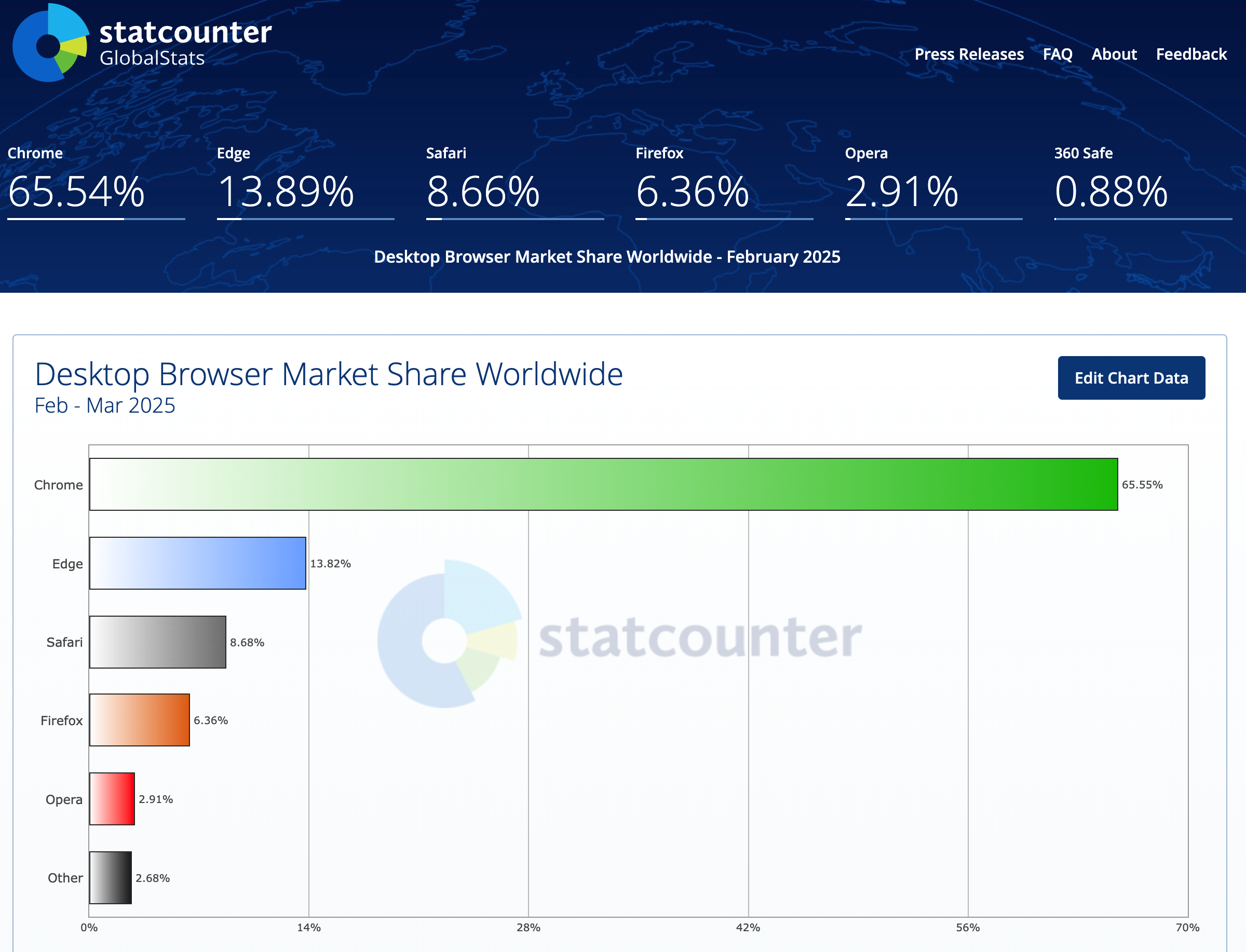谷歌Chrome依然是桌面浏览器市场的绝对王者,Chrome在2025年2月的市场份额为65.55%,较上月略有下降,但其压倒性的市场地位仍然难以撼动。