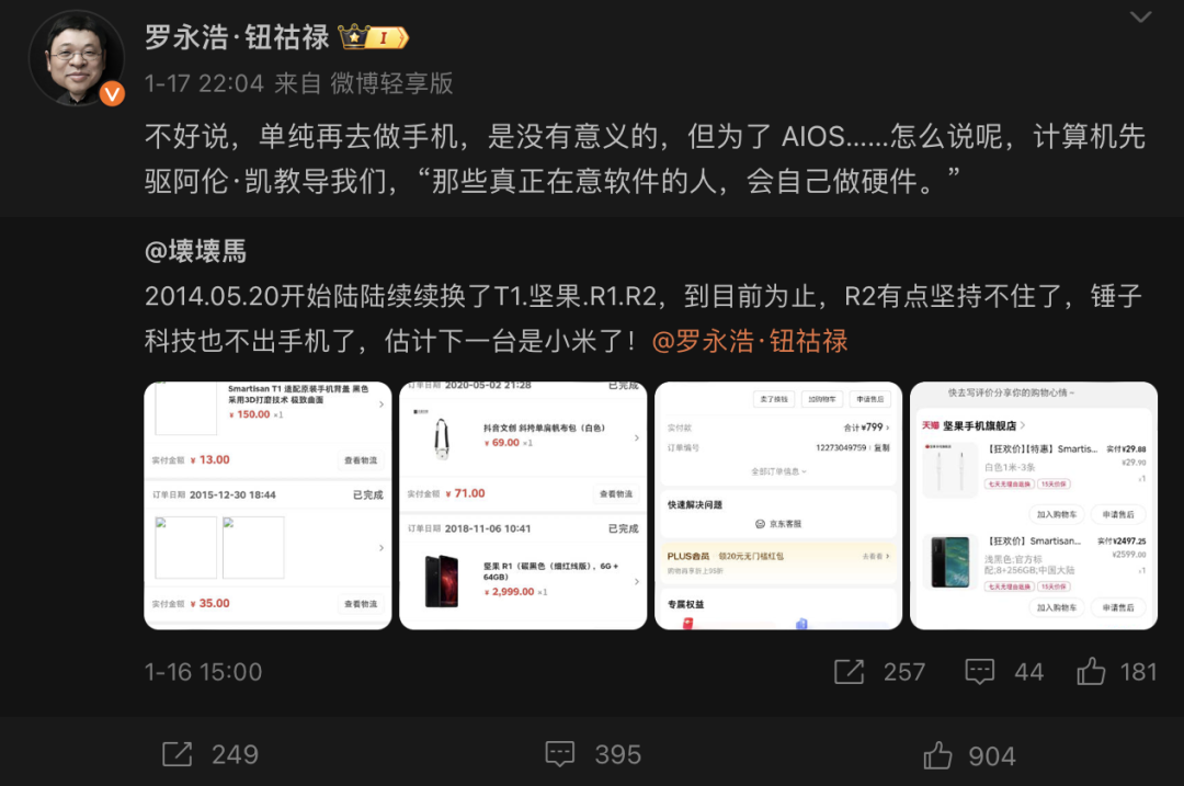 罗永浩对AIOS的兴趣其实有迹可循。1月中旬,罗永浩在微博透露了他对AIOS的看法,他引用了计算机先驱阿伦凯的话“真正在意软件的人,会自己做硬件”,言语间透露出做AIOS的真实目的,是继续回归硬件赛道。