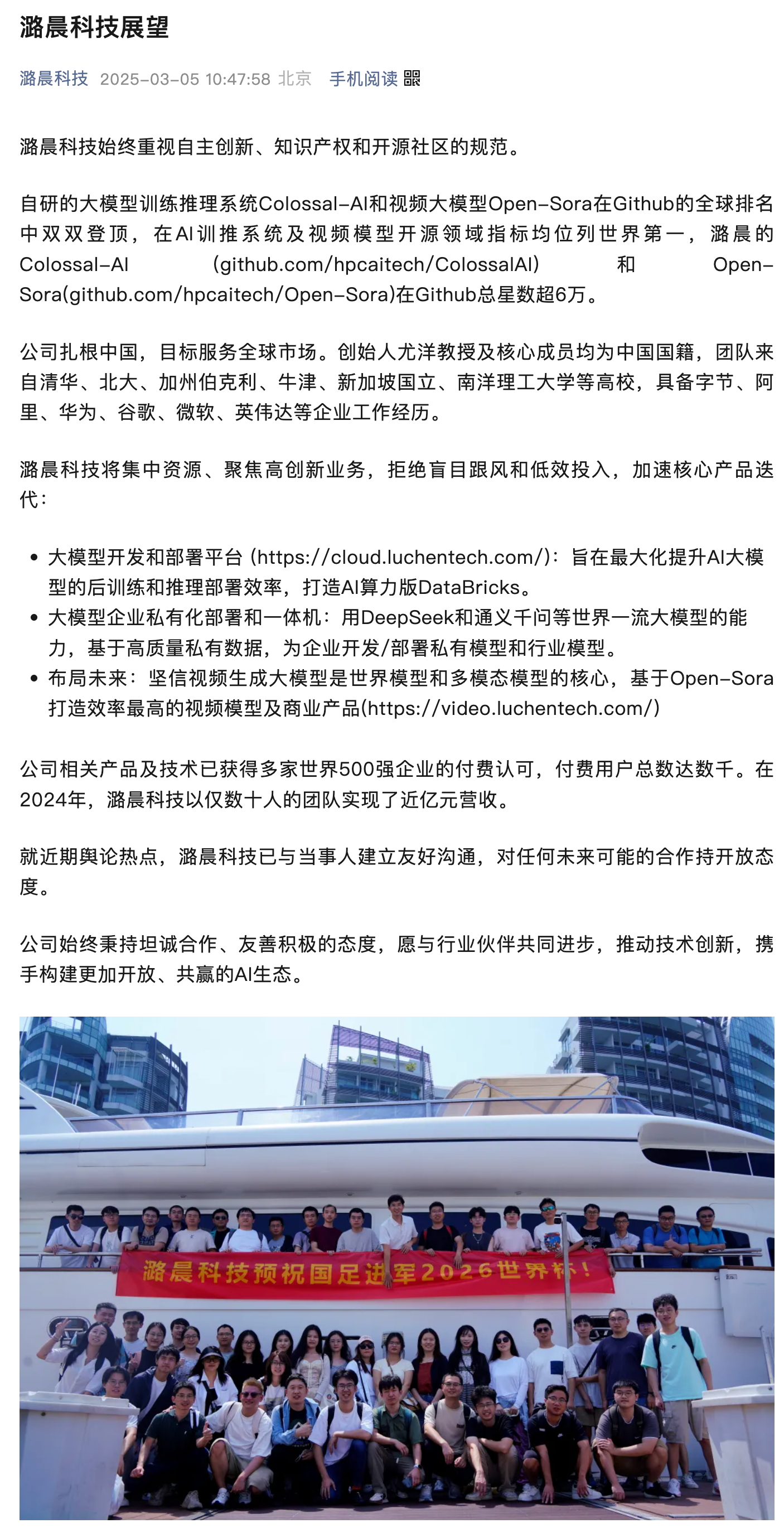 “潞晨科技”公众号今日发文称,潞晨科技将集中资源、聚焦高创新业务,拒绝盲目跟风和低效投入,加速核心产品迭代。此外还提到,就近期舆论热点,潞晨科技已与当事人建立友好沟通,对任何未来可能的合作持开放态度。