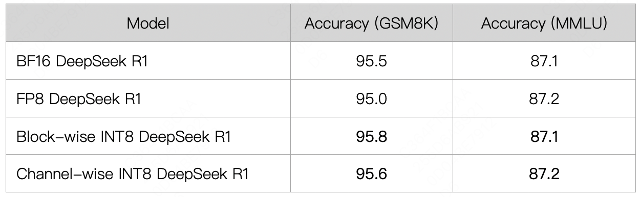 我们分别应用上述两种量化方法,对开源的DeepSeek R1模型进行了INT8量化处理,并在GSM8K和MMLU两个数据集上对量化后的模型进行了精度评估。评估结果如下表所示,相比基线的BF16和FP8模型,两种INT8量化模型的精度基本无损。