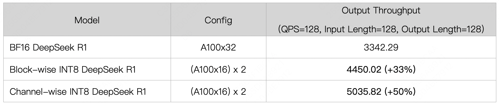 以BF16模型为Baseline,我们在A100-80G GPU上对两种INT8模型进行了推理吞吐评估。得益于更低的显存要求,INT8量化模型仅需要16张A100 GPU即可推理,但是BF16模型需要32张A100 GPU。为了比较的公平性,我们统一在32张A100 GPU上进行吞吐测试。结果如下表所示,分块量化的INT8推理相比BF16可以提升33%的吞吐;通道量化的INT8推理得益于更低的反量化开销,可以进一步达到50%的吞吐提升。