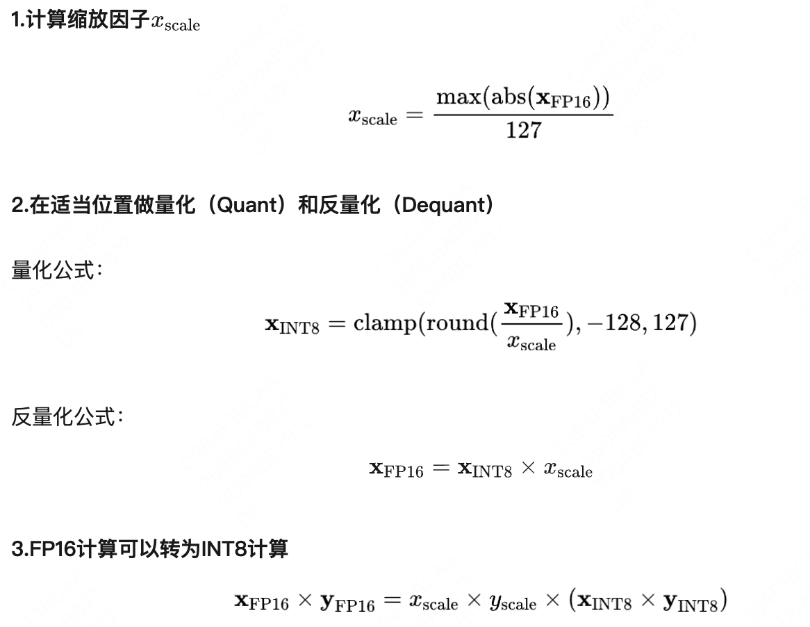 模型量化是将模型的权重和激活值等数据从高精度(如BF16)转化为低精度(如INT8),并尽可能保证转化前后模型效果一致的过程。以常见的INT8对称量化为例,量化过程如下所示: