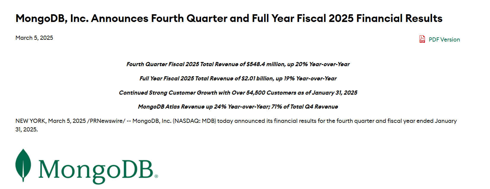 MongoDB 公司公布了 2025 财年第四季度业绩,终于实现了季度盈利,超出了华尔街对盈利和收入的目标。但该公司对新财年的预期却令人大失所望,导致投资者纷纷逃离,其股价在尾盘交易中暴跌。