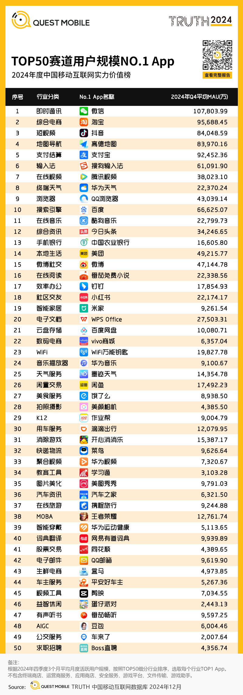 QuestMobile近日发布了2024年度中国移动互联网实力价值榜,TOP50赛道用户规模NO.1 APP如下。