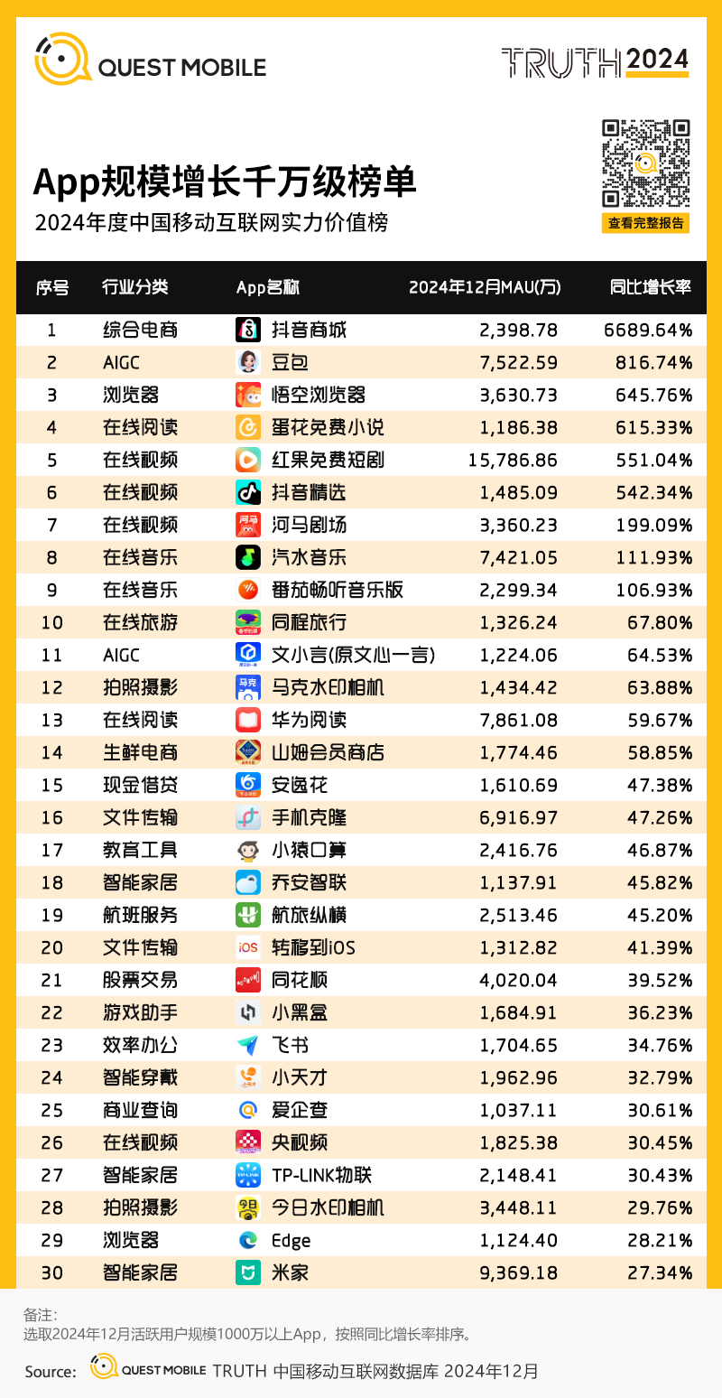 前十名的千万级体量APP增速排行榜中,字节旗下产品占据七夕,分别是:抖音商城、豆包、悟空浏览器、红果免费短剧、抖音精选、汽水音乐、番茄畅听音乐版,可见字节流量之猛。