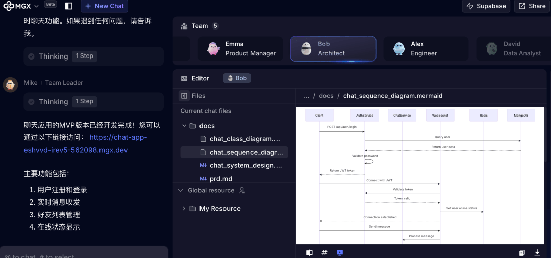 基于优刻得云平台的数据管理能力,MGX记录每个Agent的操作日志并生成可视化报告,用户可追溯代码生成路径、测试覆盖率等关键指标,满足企业审计要求。支持人工介入调整(如手动修改PRD或架构图),智能体自动同步变更至下游环节,保持流程连贯性。