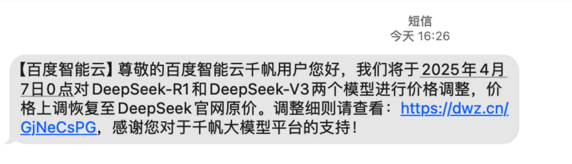 此外,百度智能云今日也向用户发送通知,称将于2025年4月7日0点对DeepSeek-R1和DeepSeek-V3两个模型进行价格调整,价格上调恢复至 DeepSeek官网原价。