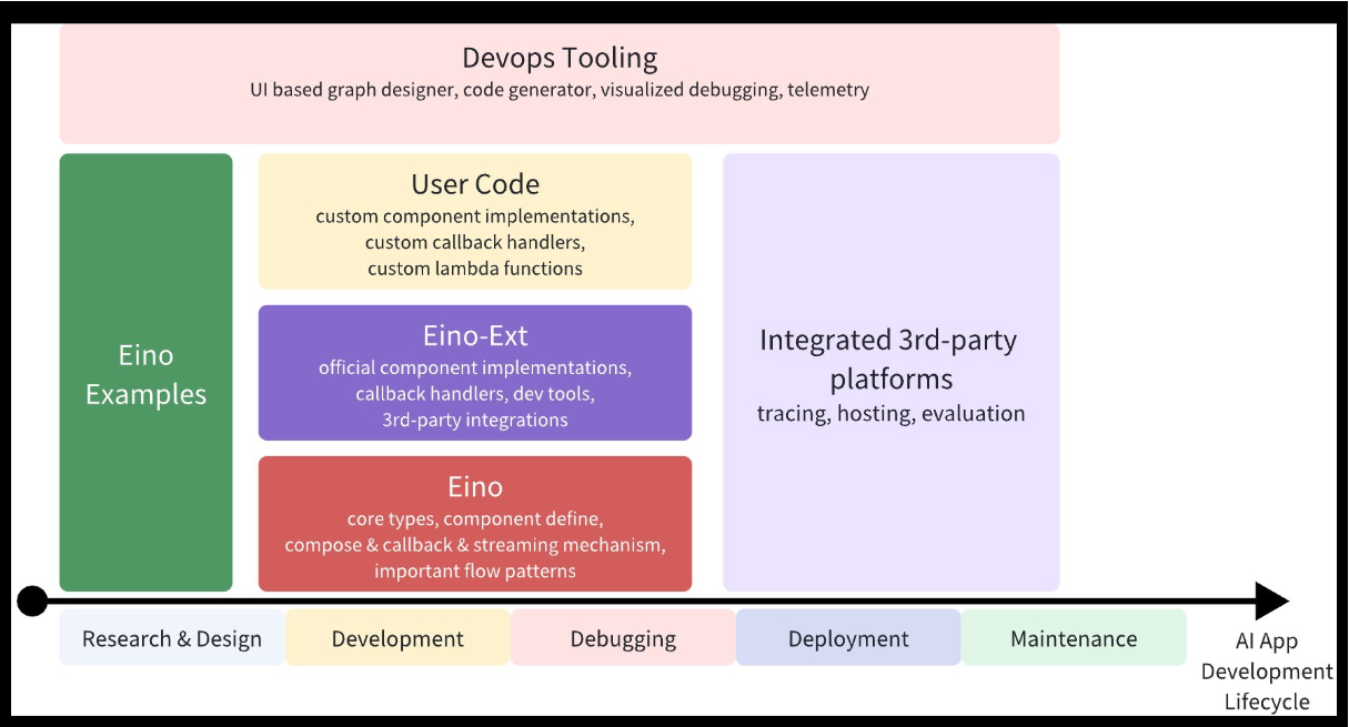 借助上述能力和工具,Eino 能够在人工智能应用开发生命周期的不同阶段实现标准化、简化操作并提高效率: