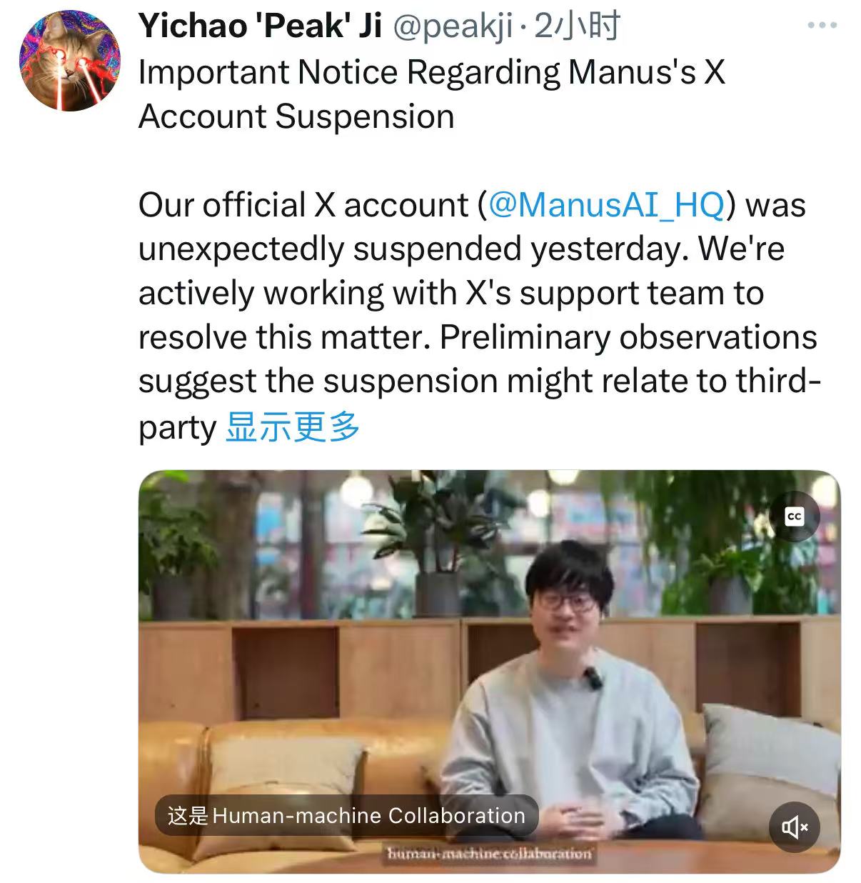 Manus 联合创始人兼首席科学家 Yichao Peak Ji(季逸超)在 X 发布了一项“关于 Manus 的 X 账号被冻结”的声明称: