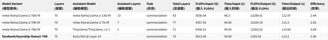 对于除 Llama2 70B 之外的所有模型大小和生成,提前退出自推测解码比常规的两模型推测解码更快。 -