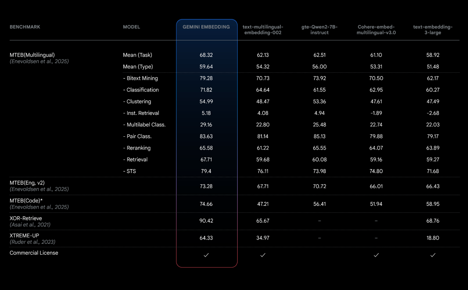 这款基于 Gemini 模型本身训练的嵌入模型,凭借其对语言和语境的深刻把握,已在 Massive Text Embedding Benchmark(MTEB)多语言排行榜上以平均得分68.32的成绩遥遥领先,超过竞争对手5.81分。其出色的表现不仅证明了模型的高通用性,也使其在金融、科学、法律、搜索等多个领域具备广泛的应用潜力。