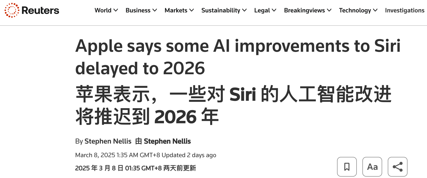 3 月 7 日,苹果向部分媒体提供一份声明,承认将推迟部分原本计划在 iOS 18 中发布的 Siri 相关 Apple Intelligence 功能。
