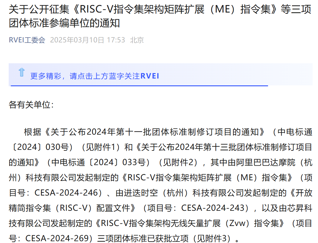 中国电子工业标准化技术协会RISC-V工委会发布“关于公开征集《RISC-V指令集架构矩阵扩展(ME)指令集》等三项团体标准参编单位的通知”。