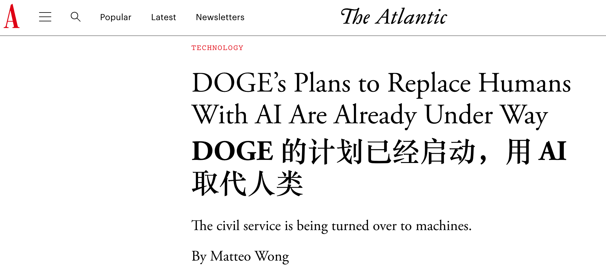 大西洋月刊报道称,马斯克领导的政府效率部(DOGE)正在努力缩减和重组美国公务员队伍,这一努力已进入新阶段。其理念很简单:利用生成式人工智能来自动化以前由人完成的工作。
