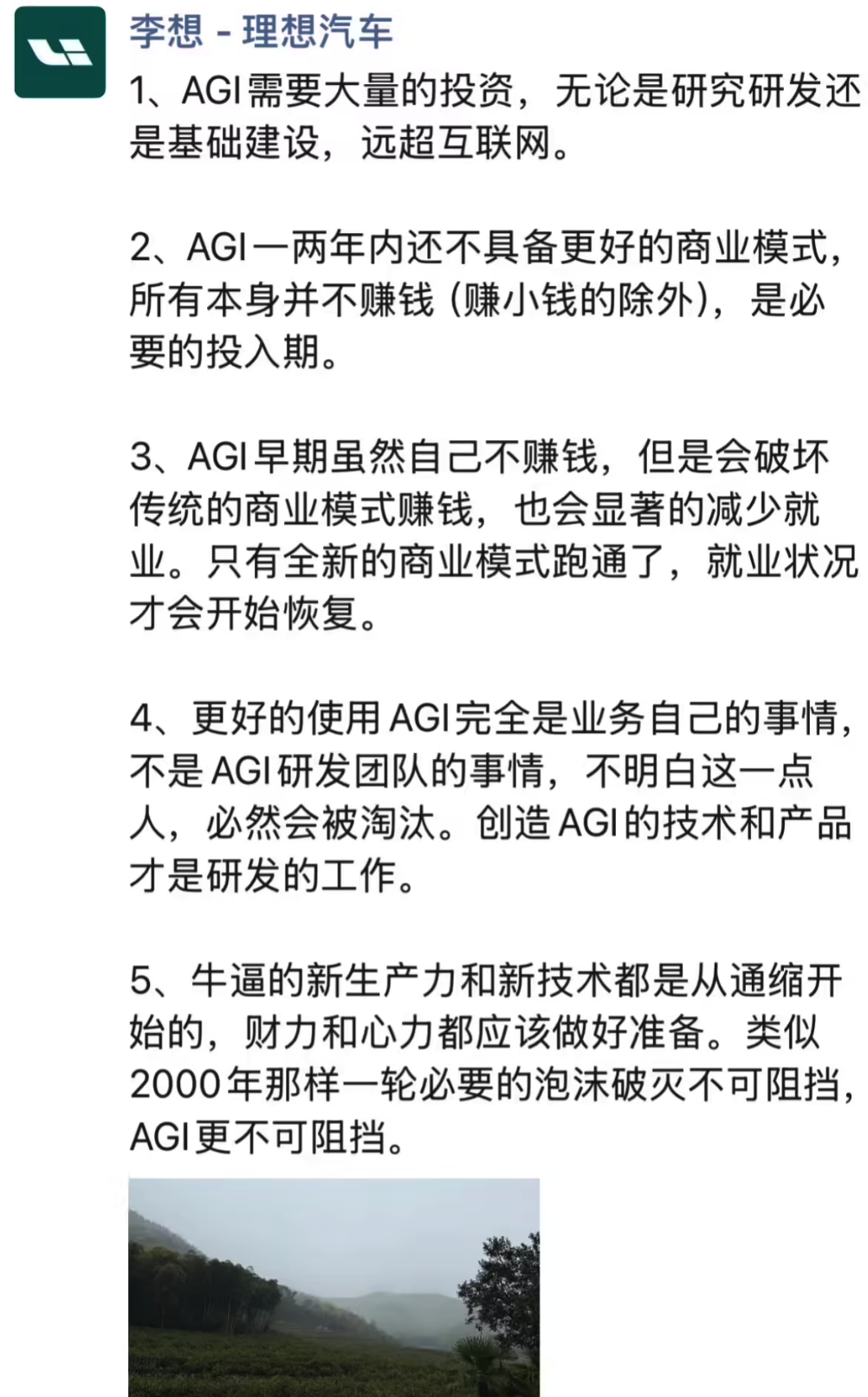 理想汽车CEO李想近日在朋友圈分享了对AGI的一些观点,他表示,AGI所需的投资远超互联网,一两年内还不具备好的商业模式。