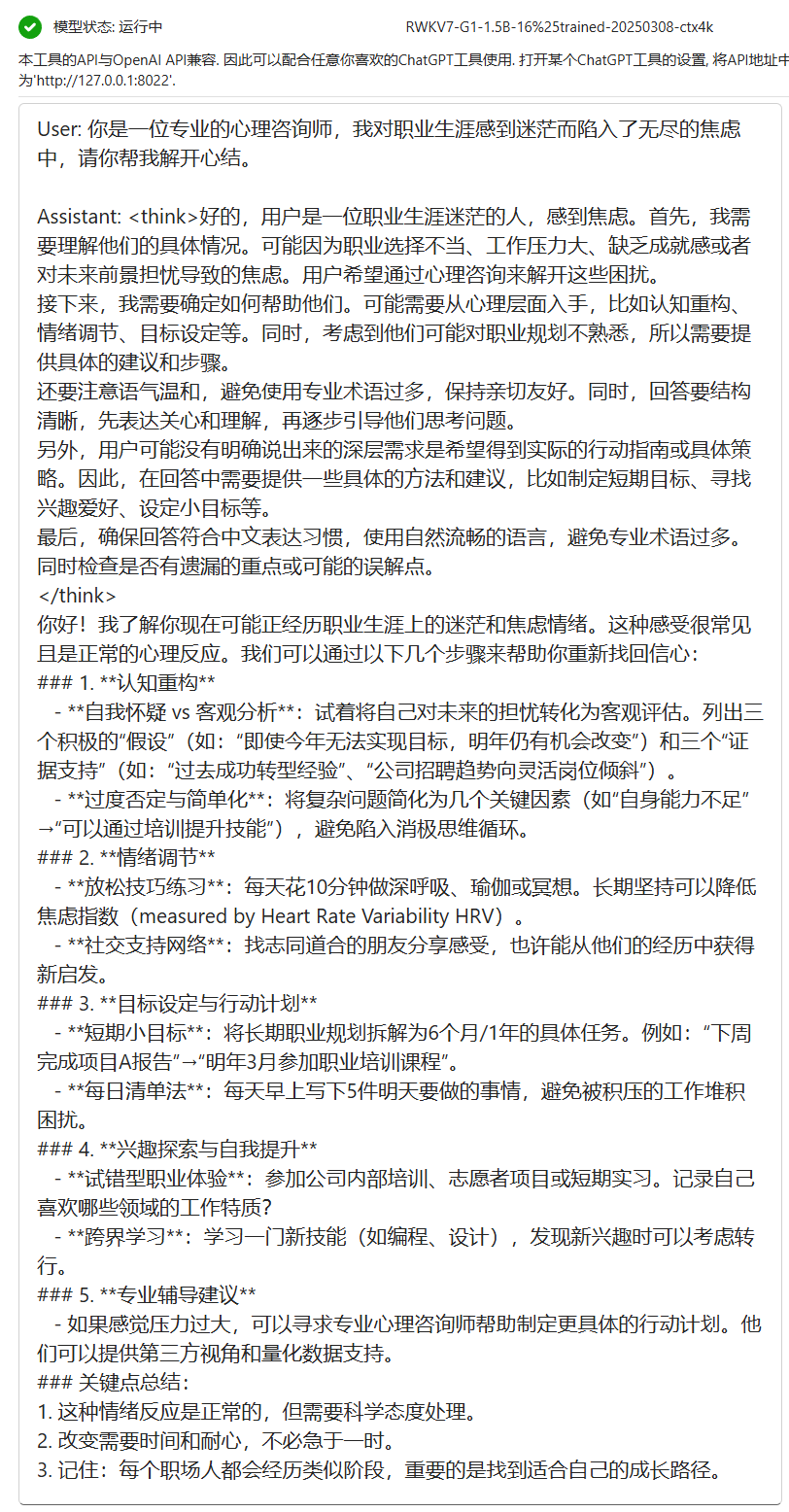 RWKV Runner 和 Ai00 等 RWKV 推理工具正在适配 reasoning 聊天模式,因此目前只能在续写模式中体验 reasoning 功能。