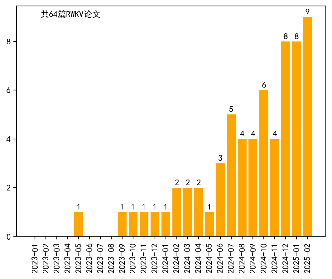 RWKV 社区近期新增了大量 RWKV 学术研究论文,以下是截至 2025 年 2 月的 RWKV 论文数量统计表格: