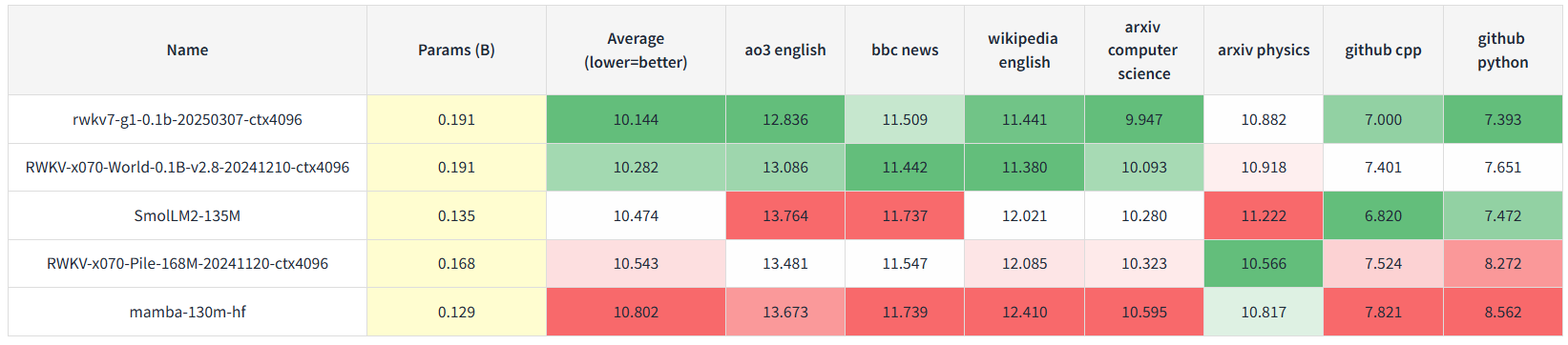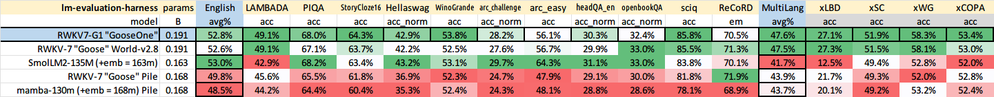 RWKV7-G1 0.1B 的英文和多语言能力相比 RWKV-7-World 0.1B 继续提升: