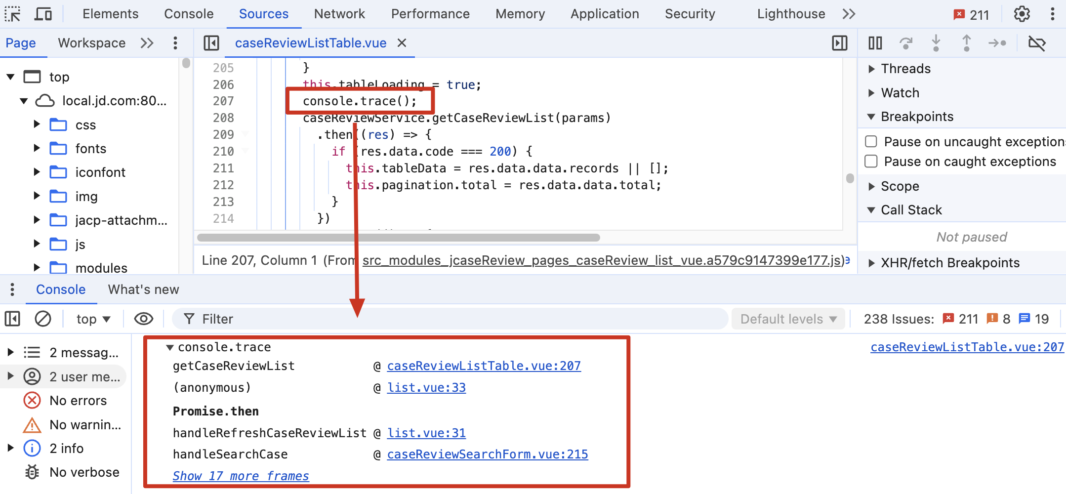 我们此时可以看到右侧的Call Stack中从上到下排列着函数调用栈信息,如下图我们可以查看到,在执行到该断点的时候,我们已经先在其他文件的handleRefreshCaseReviewList、handleSearchCase函数中执行过相关代码了。我们可以点击函数名右侧的文件地址,快速查看对应的代码,这样子,我们对其调用逻辑清晰了许多,排查问题的效率自然会提高