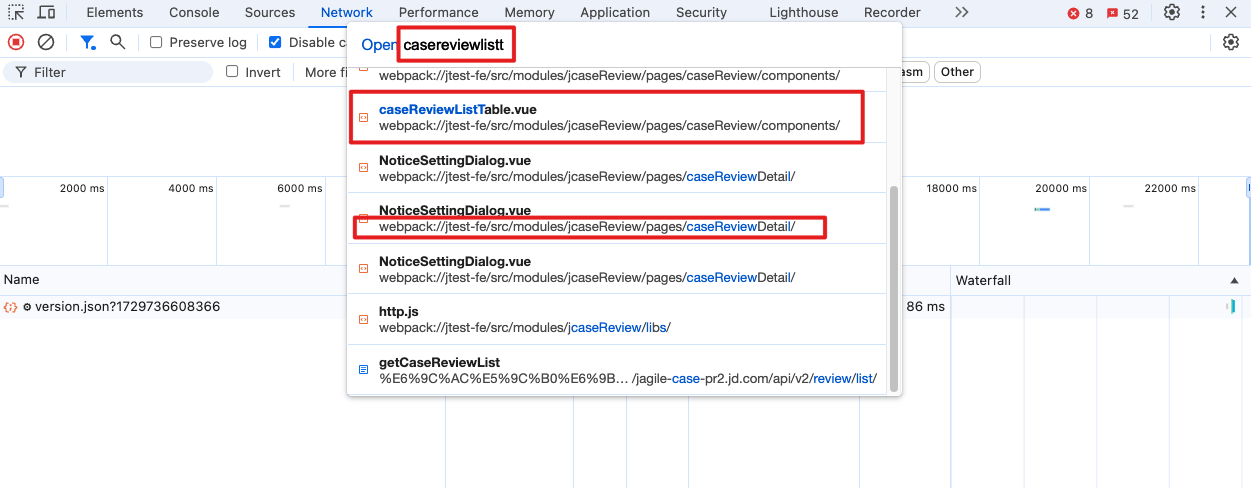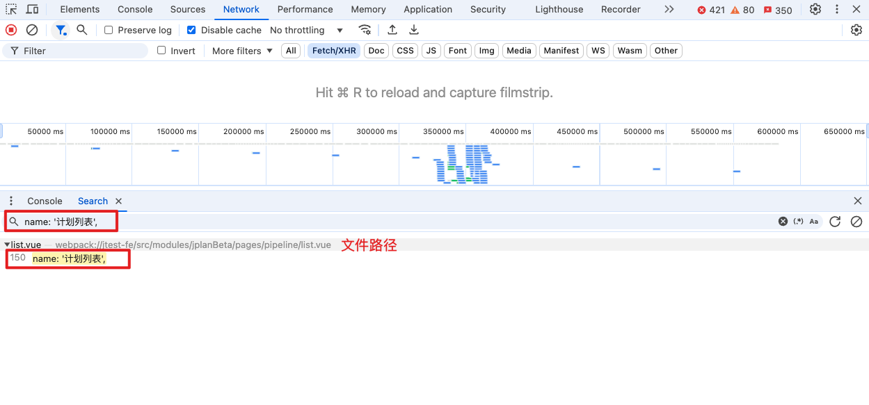 比如我输入“name: '计划列表',”这个关键词,它会在这个页面已经引入的资源搜索对应的代码关键词,然后把匹配的文件展示在下方,我们就可以立即选择然后打开对应的代码文件了