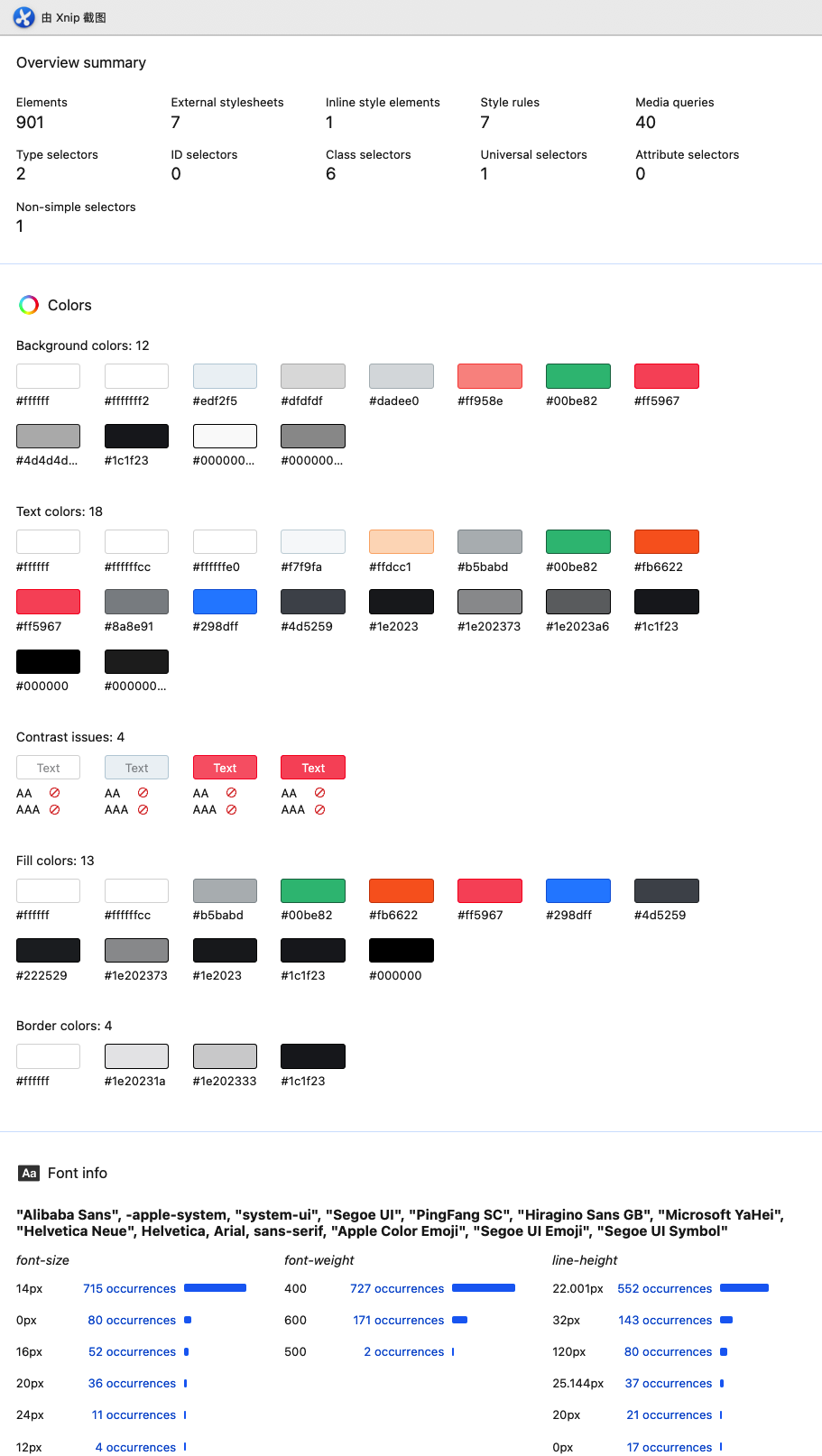 收集好以后,我们便可以从颜色、字体等维度获取到该网站的样式信息