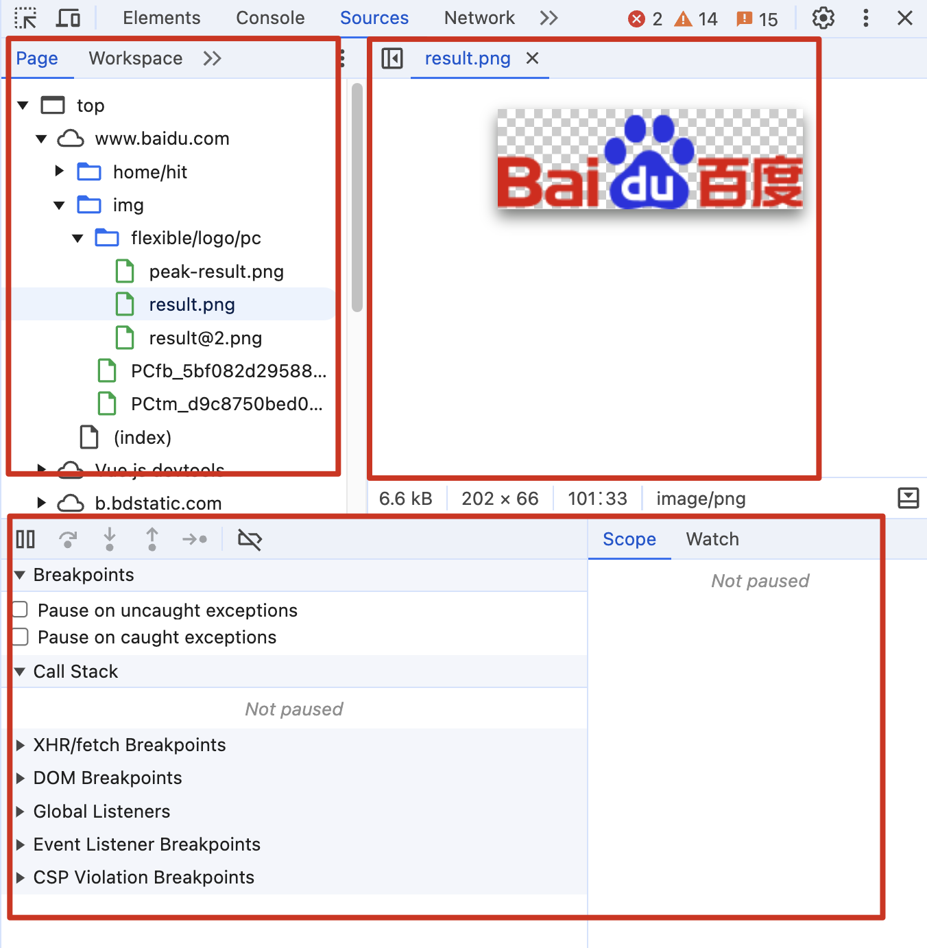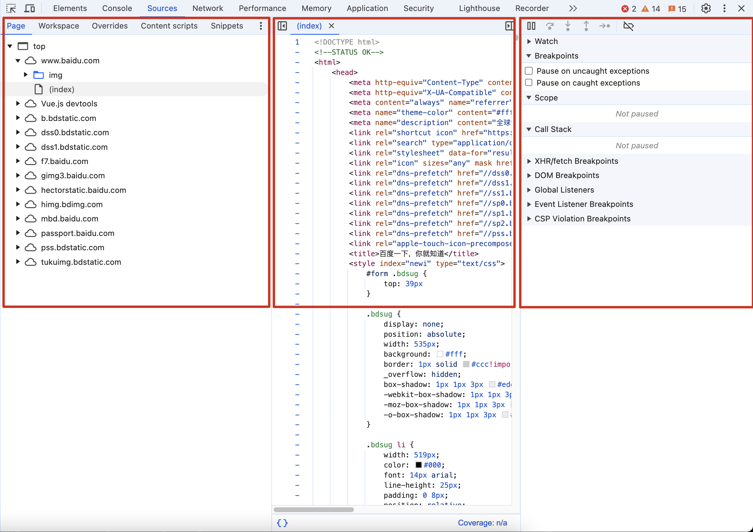 source面板是我们断点调试经常用的到的地方,我们可以先大概认识一下它长什么样子,大概有什么功能
