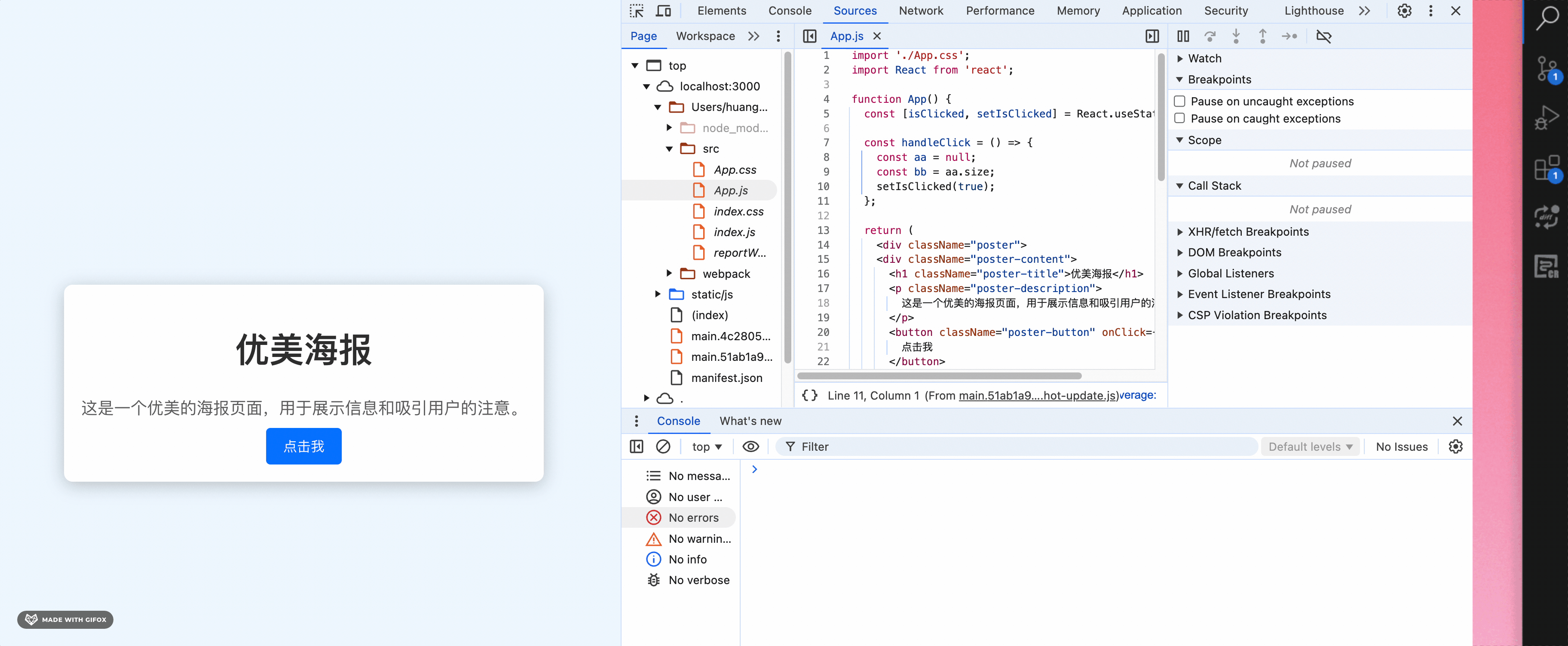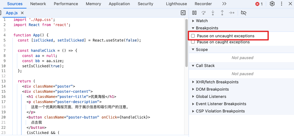 我们可以在Breakpoints中勾选Pause on uncaught exceptions,当代码执行到这些有异常的代码时,自然会暂停