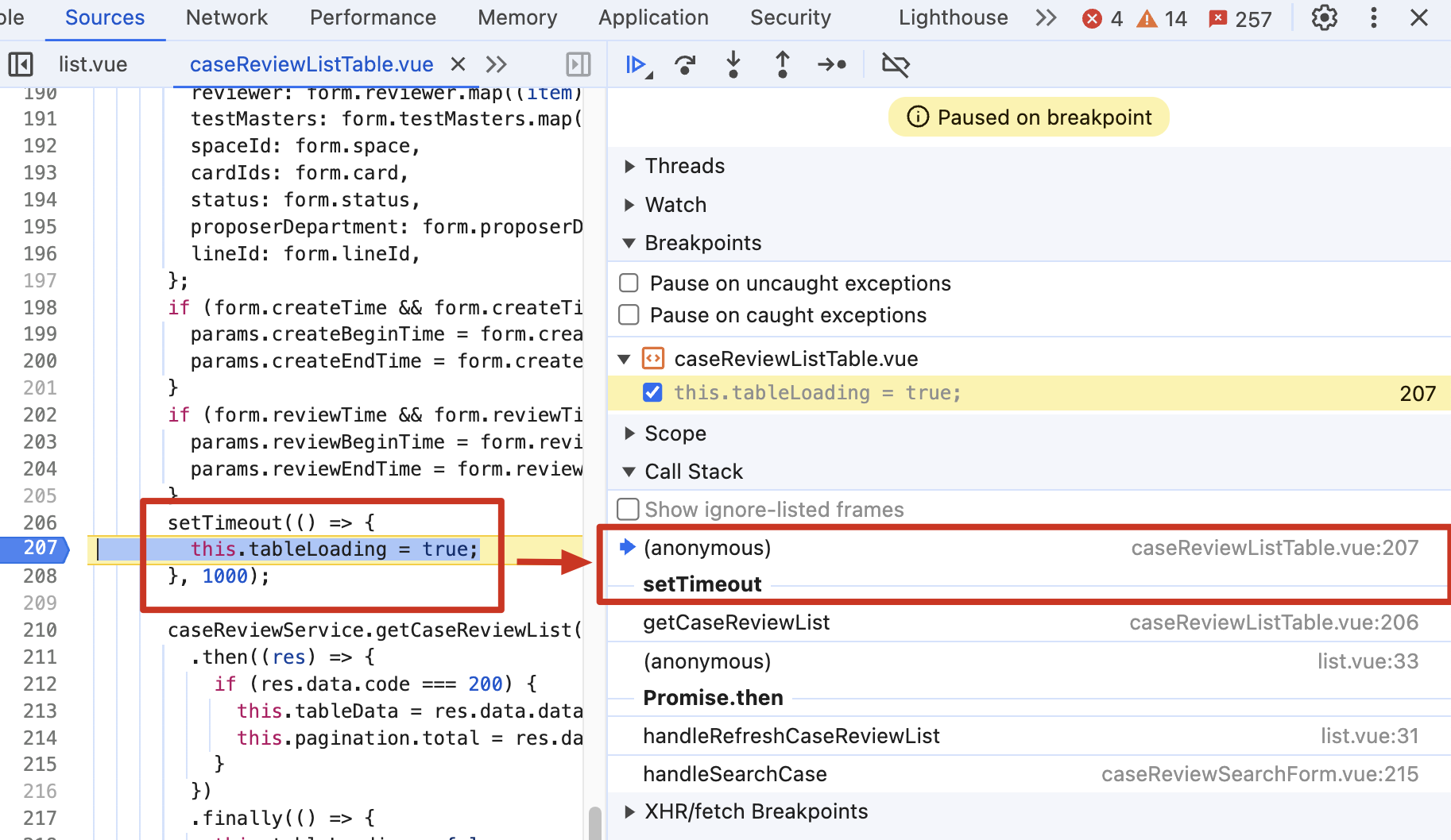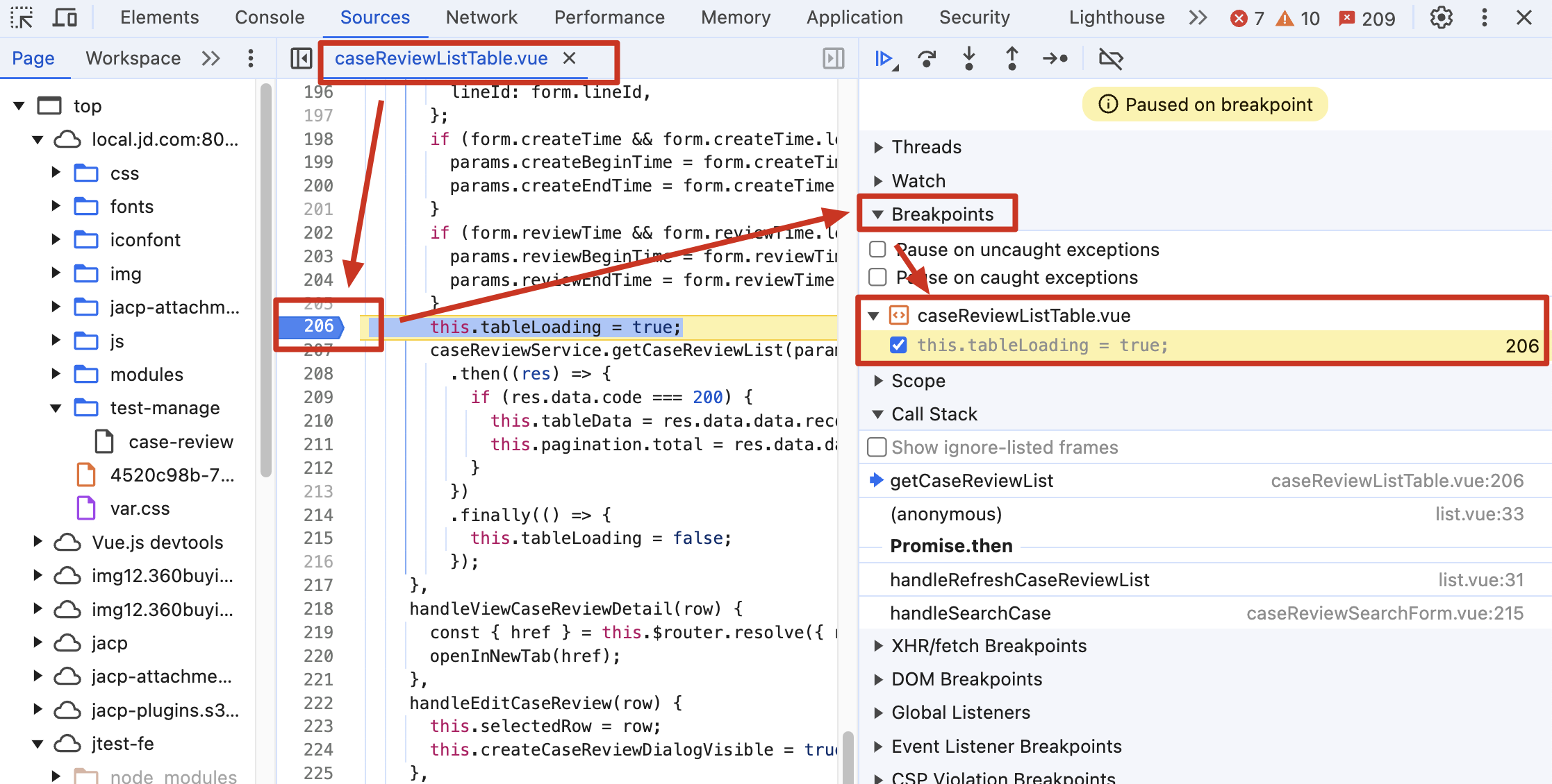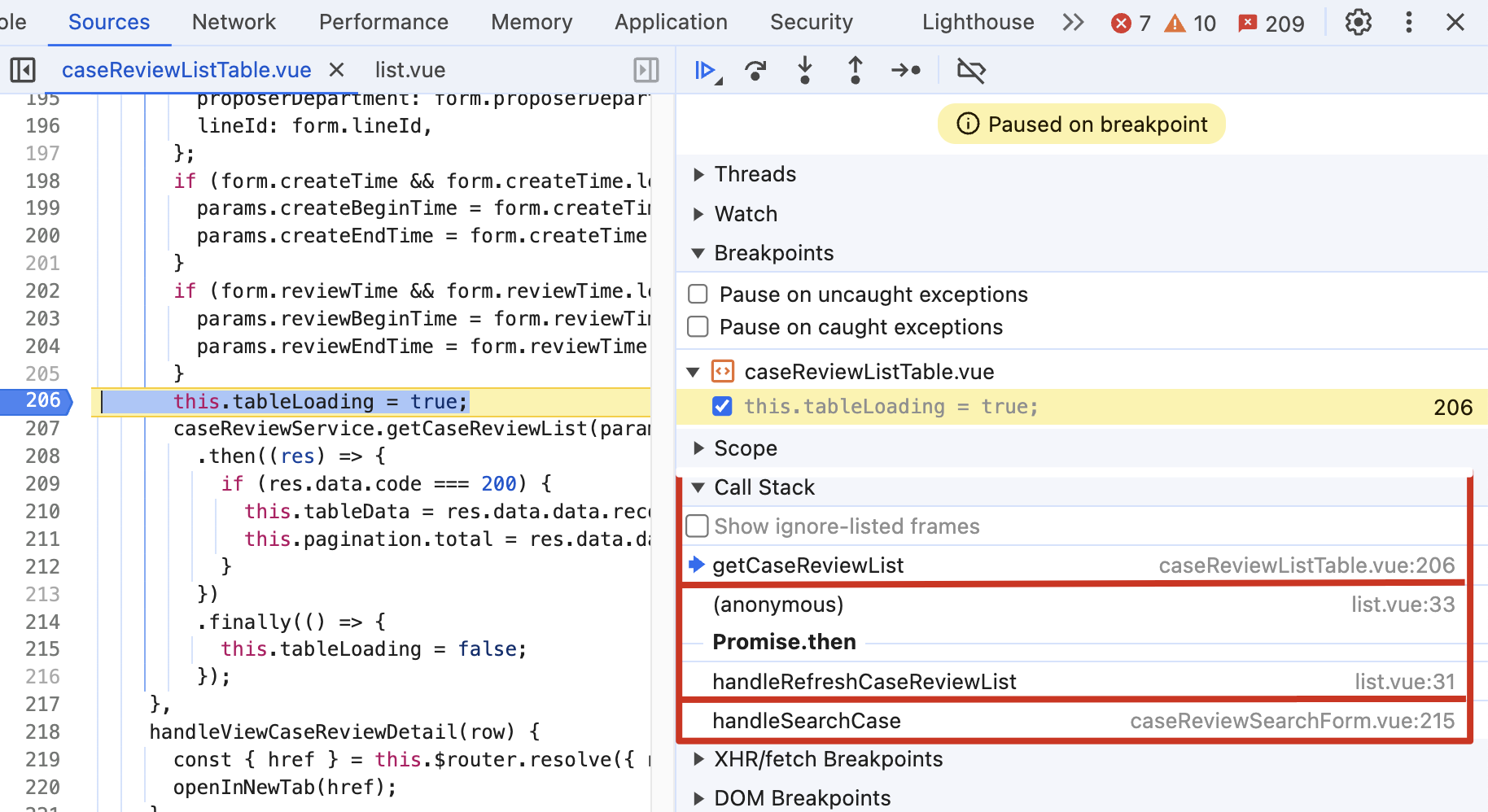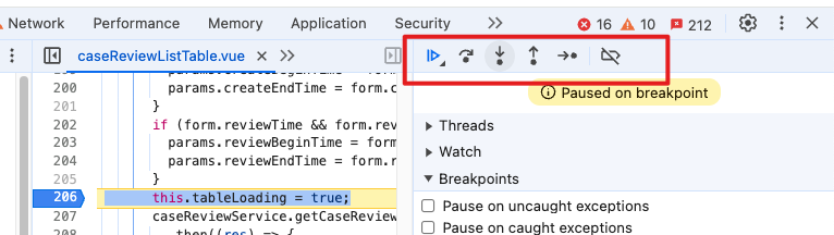比如我在caseReviewListTable文件的第206行代码中打了一个断点,当代码执行到这部分逻辑的时候,他就自然会暂停