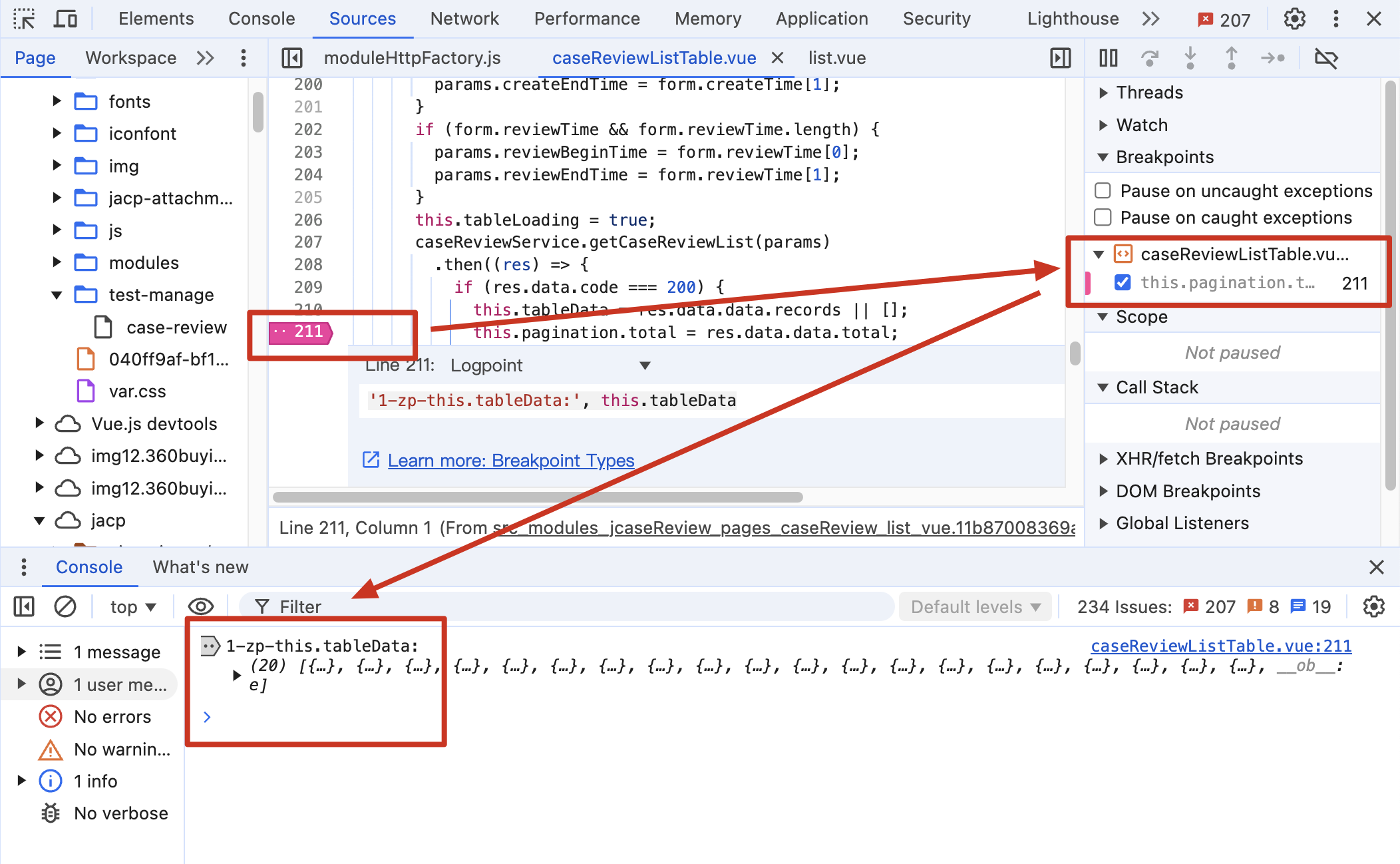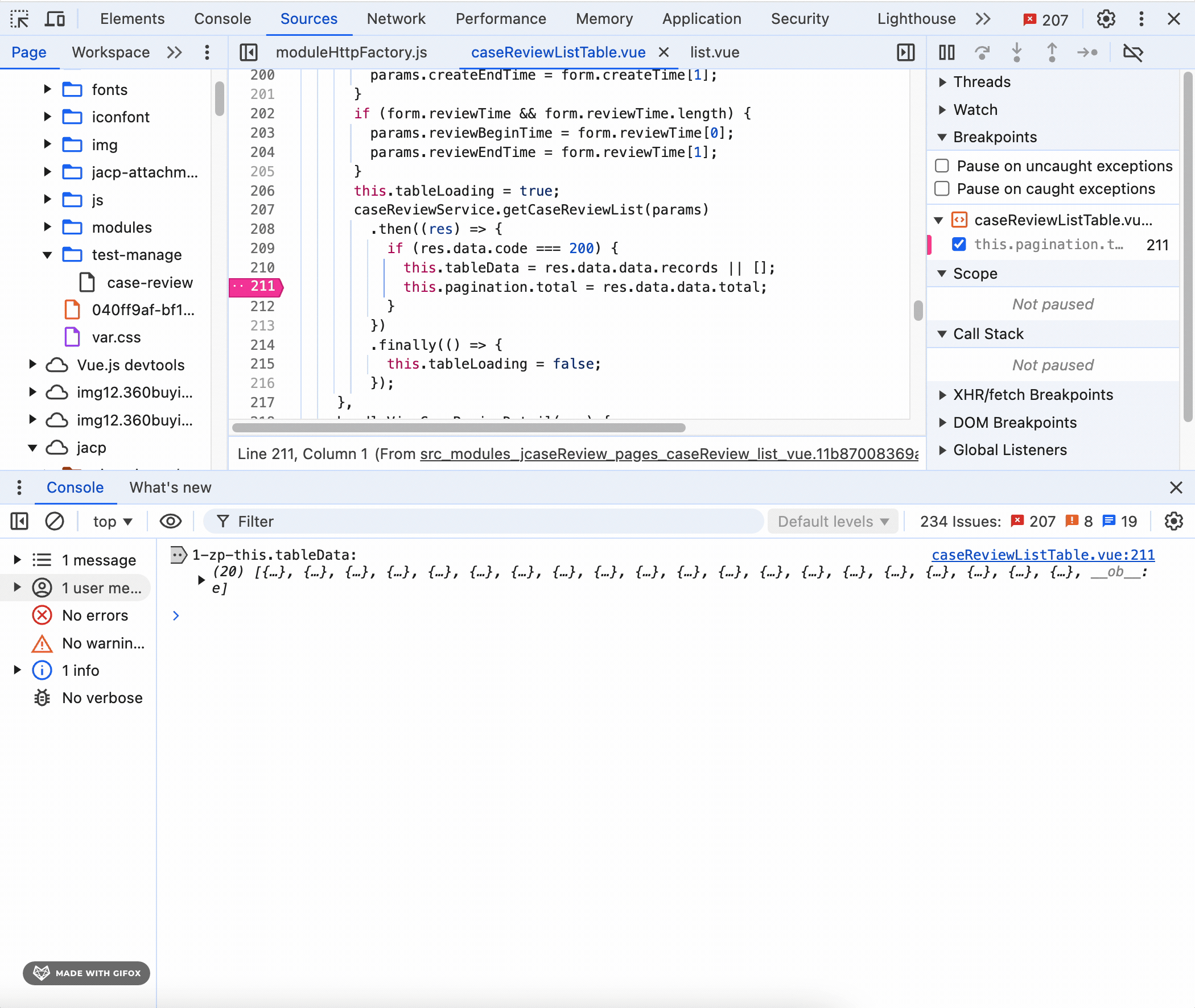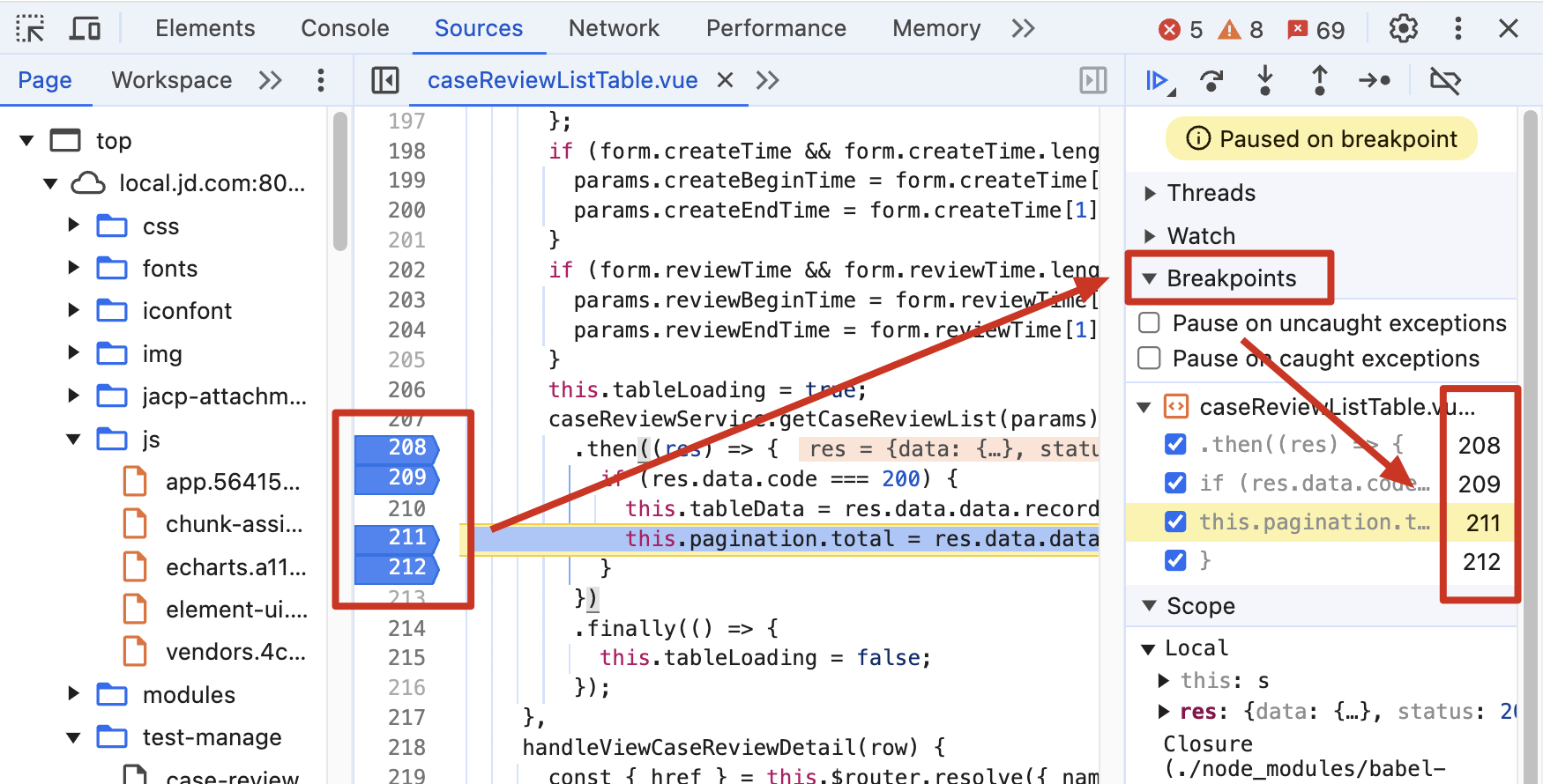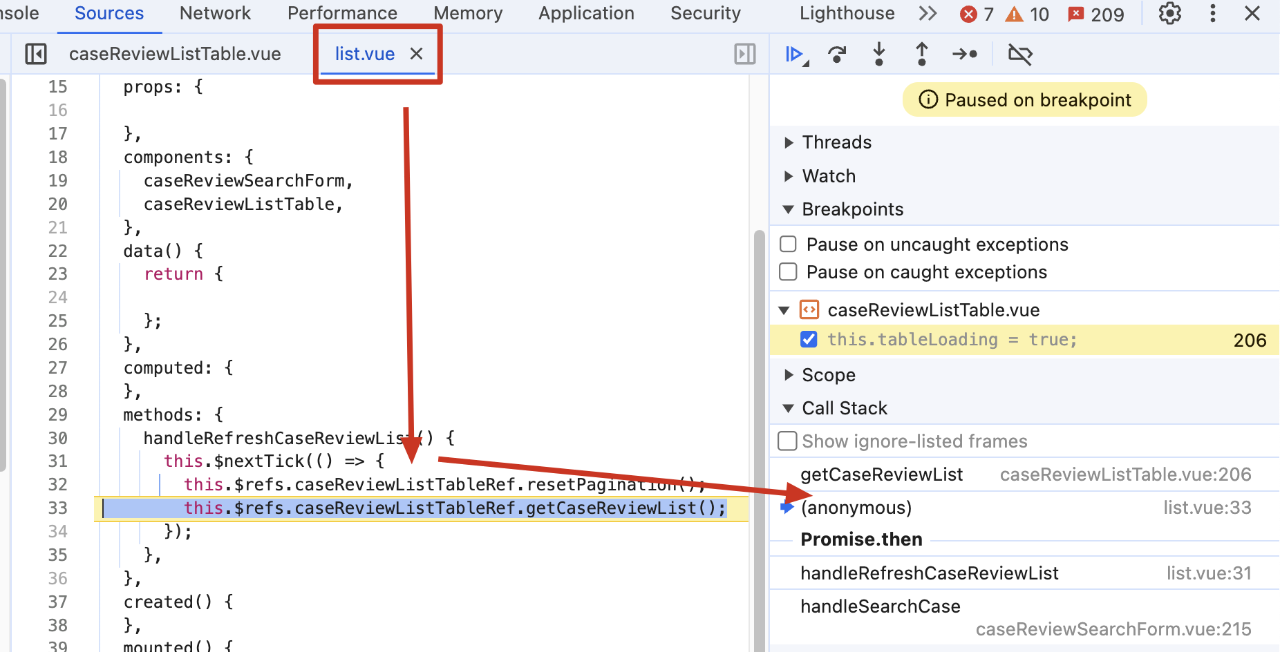 比如我在caseReviewListTable文件的第206行代码中打了一个断点,当代码执行到这部分逻辑的时候,他就自然会暂停