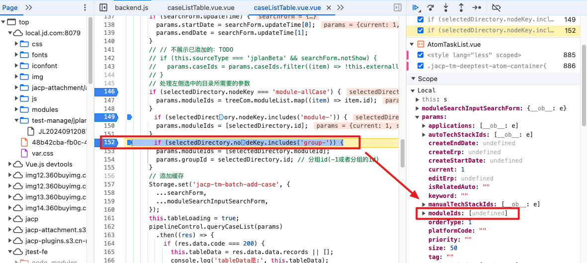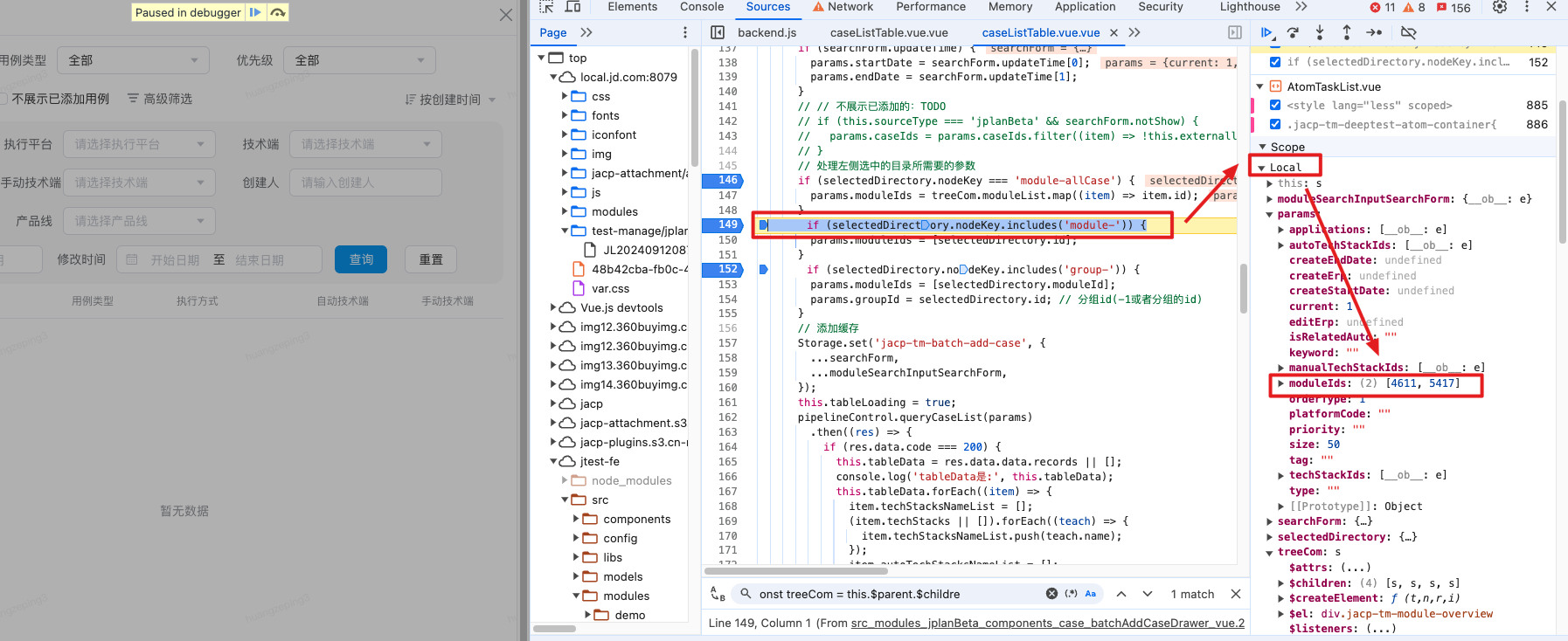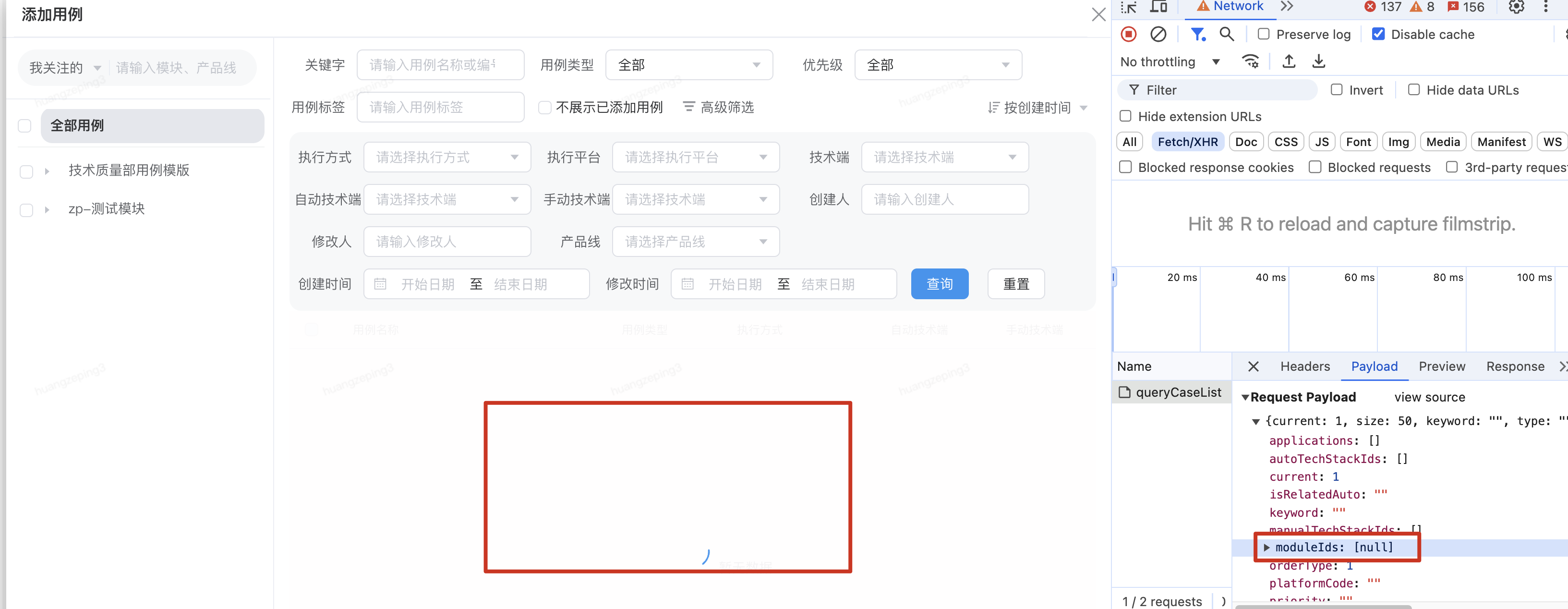 在开发过程中,用例列表刚开始还可以加载出用例,怎么突然没有数据返回了。查看接口发现moduleIds参数出现了问题