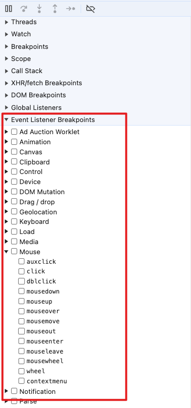 当用户发生交互时出现问题,这时我们就可以添加事件监听器添加断点来捕获这些事件以检查交互时的问题。可以在Source面板右侧的Event Listener Breakpoints中勾选相应的事件