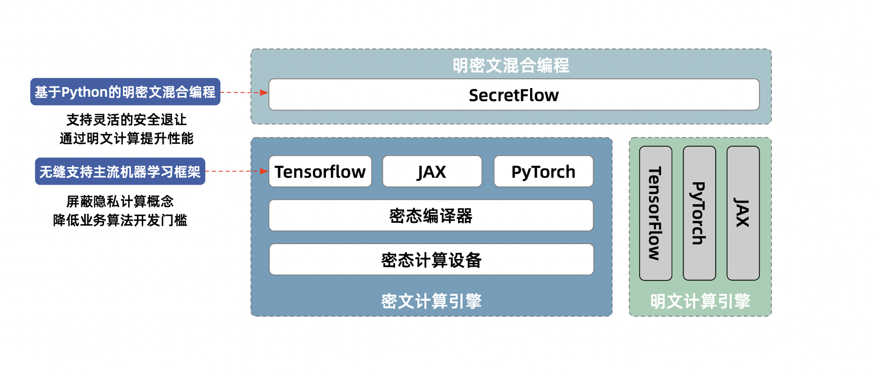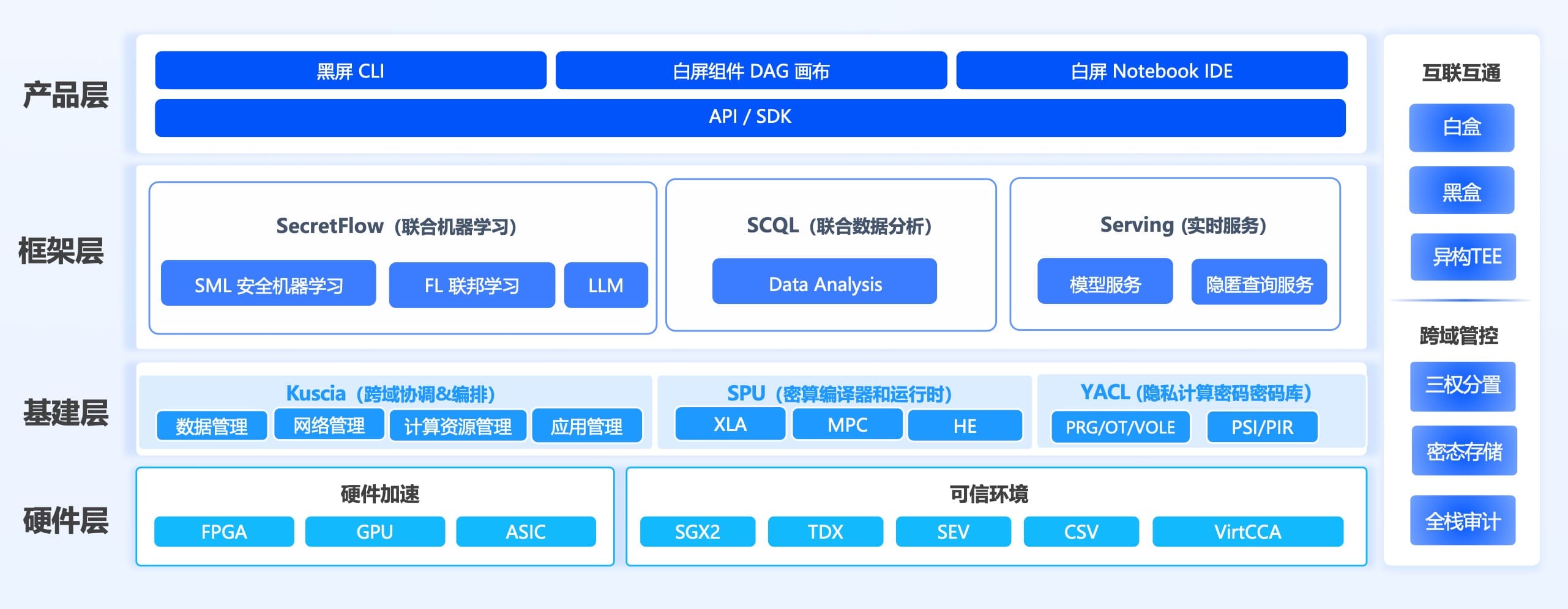 - 统一集成,一站式搞定:内置安全多方计算、联邦学习、差分隐私等主流隐私计算技术,无需再单独学习多个框架。