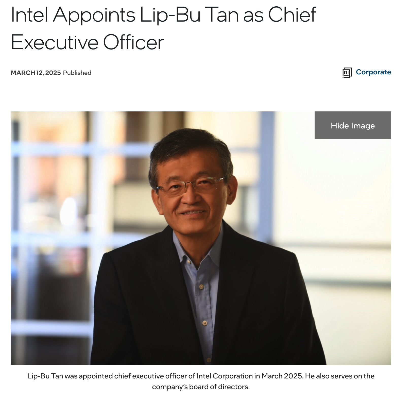 3月13日,英特尔任命Lip-Bu Tan(陈立武)为首席执行官(CEO),3月18日生效。他将接替临时联席首席执行官大卫·津斯纳(David Zinsner)和霍尔索斯(Michelle Johnston Holthaus)。