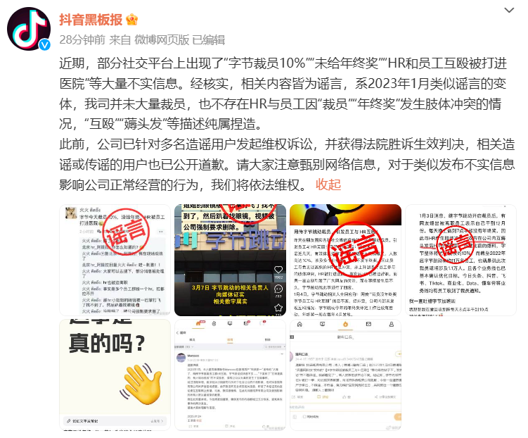 抖音黑板报发文称,近期,部分社交平台上出现了“字节裁员10%”“未给年终奖”“HR和员工互殴被打进医院”等大量不实信息。