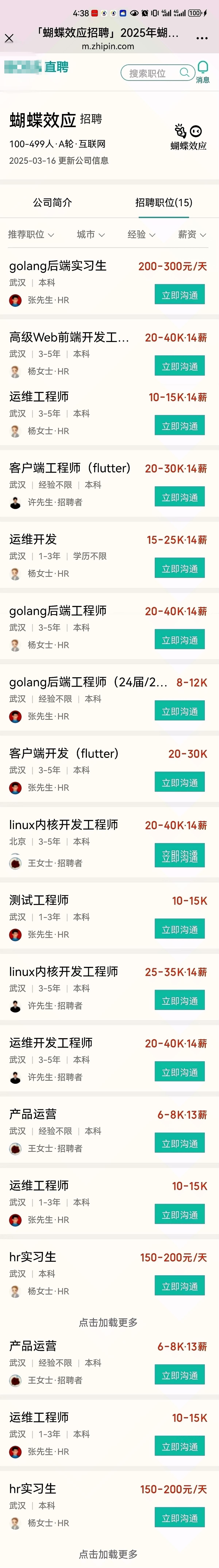 据了解,此次蝴蝶效应招聘岗位有虚拟化研发工程师、linux内核开发工程师、运维工程师、数据库运维、Web前端工程师、客户端工程师、用户运营等,月薪范围在5000元至4万元不等。