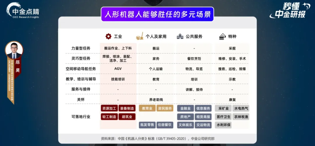 在力量型、灵巧型和空间移动导航等领域,人形机器人效率或将高于人工;在公共服务领域,从商业表演到迎宾接待,已有人形机器人的应用,未来有望拓展到更复杂的交互场景;在特种场景中,某企业的先行者系列已可在高危环境巡检,未来救援等场景应用潜力大。总体而言,人形机器人的发展趋势是从专用场景向通用场景渗透。