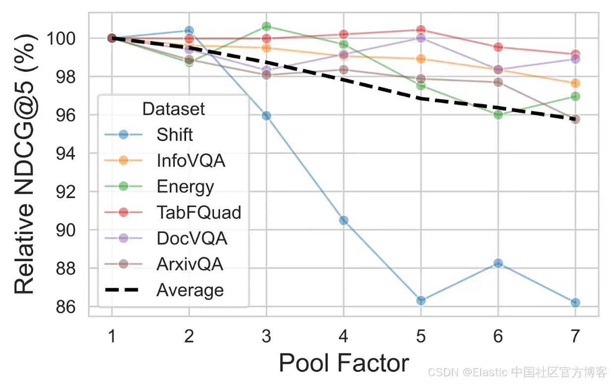 ColPali 论文为大多数数据集提出了初始的 pool factor 值为 3,这在减少总向量数量 66.7% 的同时,保留了原始性能的 97.8%。