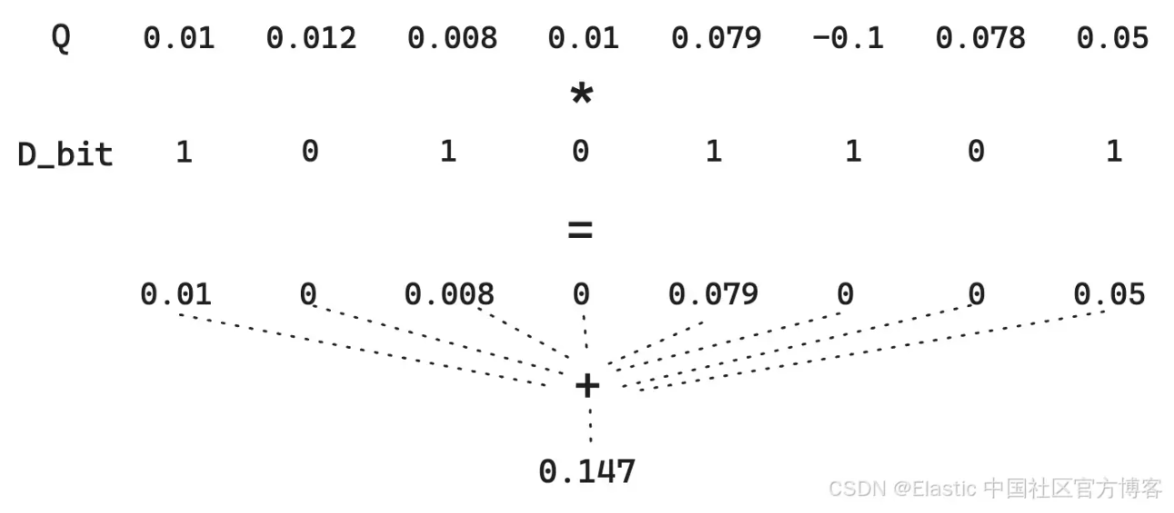 简单的二进制量化将 D 转换为 10101101,将 Q 转换为 11111011。对于 Hamming 距离,我们需要直接的位运算 —— 这是非常快速的。在这种情况下,Hamming 距离 为 01010110,其值为 86。因此,得分就变成了该 Hamming 距离的反值。请记住,更相似的向量 具有 更小的 Hamming 距离,因此反转该值可以使更相似的向量得分更高。在此案例中,得分将为 0.012。