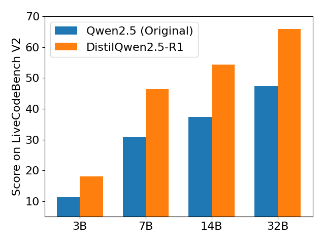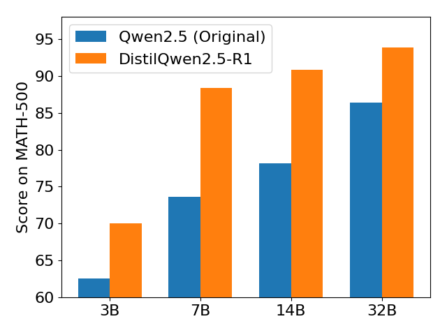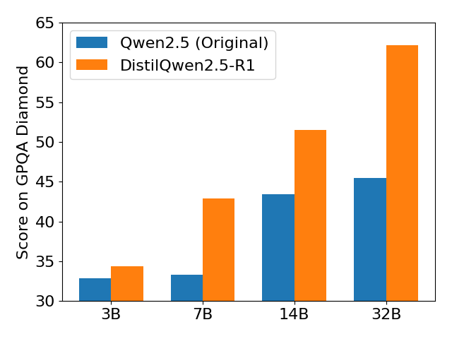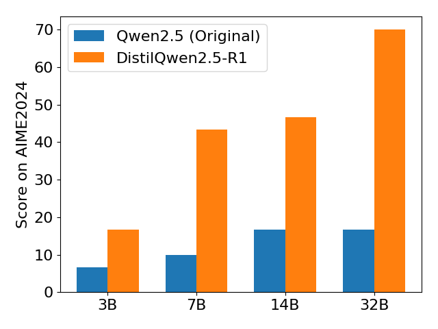 | 模型 | 训练数据量 | AIME2024 | MATH-500 | GPQA Diamond | LiveCodeBench V2 | | --- | --- | --- | --- | --- | --- | | DeepSeek-R1-Distill-Qwen-32B (reported) | 800k | 72.6 | 94.3 | 62.1 | - | | Sky-T1-32B-Preview (reported) | 17k | 43.3 | 86.4 | 56.8 | - | | OpenThinker-32B (reported) | 114k | ++66.0++ | ++90.6++ | ++61.6++ | 68.9 | | DistilQwen2.5-R1-32B | 105k | 70.0 | 93.8 | 62.12 | ++65.95++ |