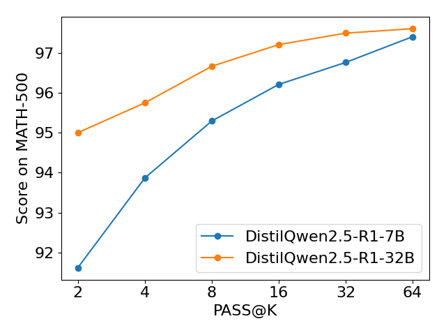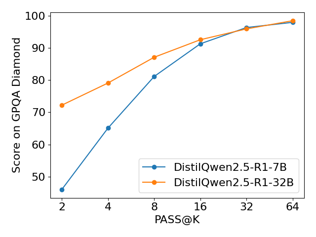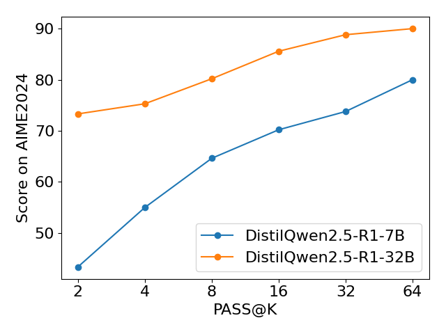 可以看出,随着模型推理次数k的逐步增加,两个模型在所有基准上的评测准确率大幅提高。值得注意的是,随着k的增加,DistilQwen2.5-R1-7B 在 MATH-500和GPQA-Diamond 上涨幅巨大,并且不断逼近 DistilQwen2.5-R1-32B 水准。这表明我们的推理模型训练框架在小模型领域内拥有巨大潜力。我们可以通过多次推理的方式使7B模型拥有媲美32B模型的能力,极大减少了推理所需的计算资源。