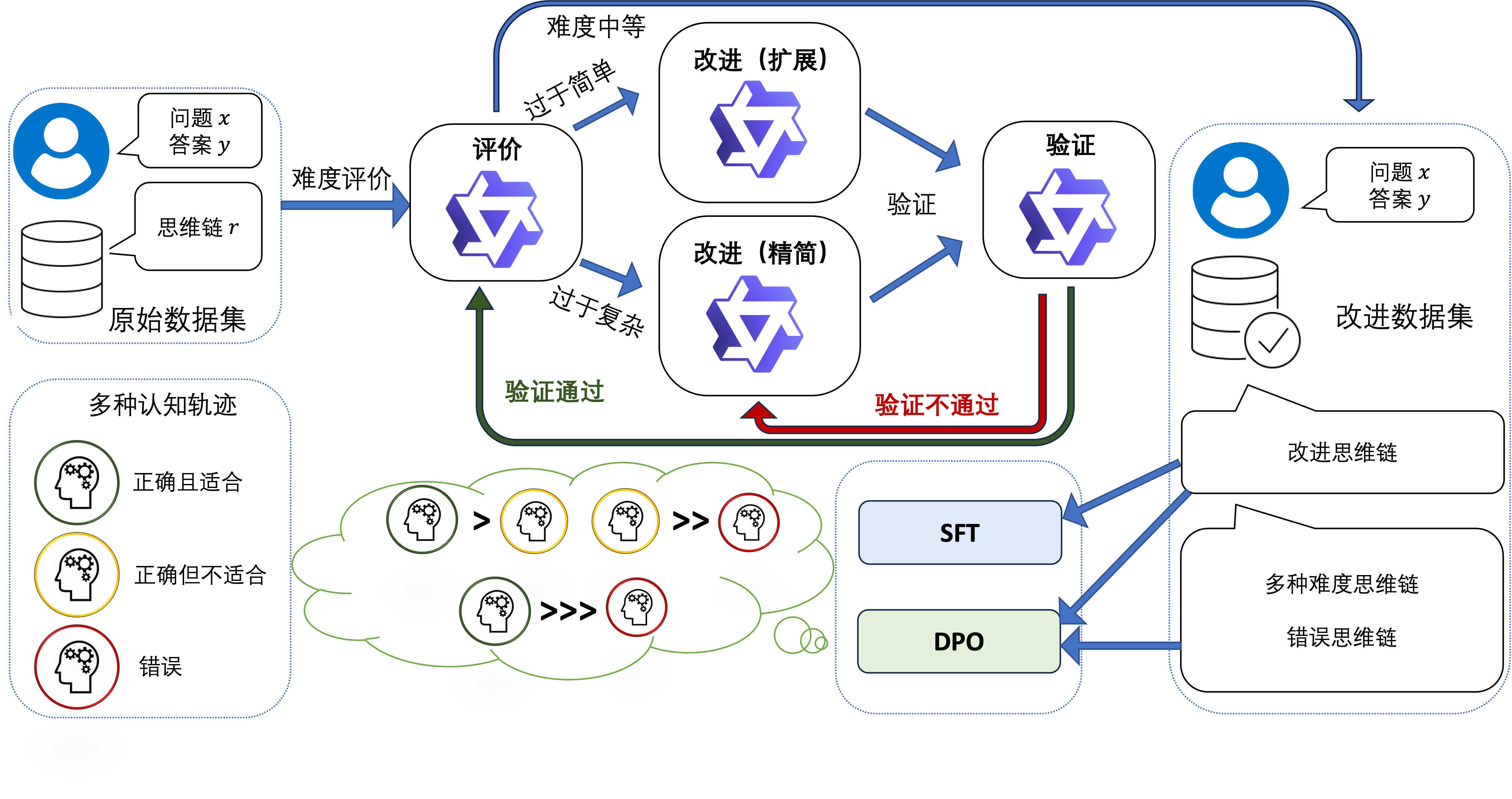 给定原始的大模型思维链数据集,例如从 DeepSeek-R1 蒸馏的数据集,在一阶段,我们先对其进行数据难度评价,接着根据数据的难度等级对其进行相应的优化,优化之后还要对结果进行验证。我们使用改进且被验证的 CoT 数据集对模型进行 SFT 训练,获取模型的基础推理能力。在二阶段,我们利用一阶段已有的不同难度的 CoT 数据构造偏好数据集,在一阶段的基础上进一步提升小模型的推理能力。