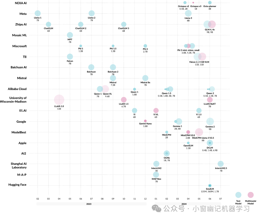 微软Phi系列 : 微软的Phi-3-mini是一个紧凑而强大的38亿参数模型,训练于3.3万亿标记数据集。尽管规模小,Phi-3-mini在性能上可与Mixtral 8x7B和GPT-3.5相媲美,在MMLU上达到69%,在MT-bench上得分8.38。Phi-3-small和Phi-3-medium规模更大,在4.8万亿标记上训练,分别拥有70亿和140亿参数,表现更优(MMLU分别为75%和78%,MT-bench得分分别为8.7和8.9)。Phi-3-vision基于Phi-3-mini衍生,拥有42亿参数,专为增强图像和文本提示的推理能力设计。
