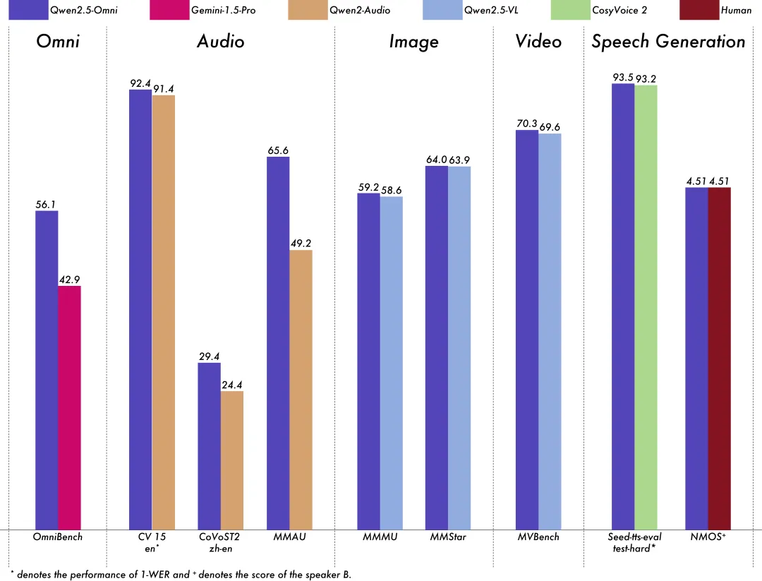 - 跨模式的强大性能:在与类似规模的单模式模型进行基准测试时,在所有模式中表现出卓越的性能。 Qwen2.5-Omni 在音频功能方面优于类似尺寸的 Qwen2-Audio, 并实现与 Qwen2.5-VL-7B 相当的性能。