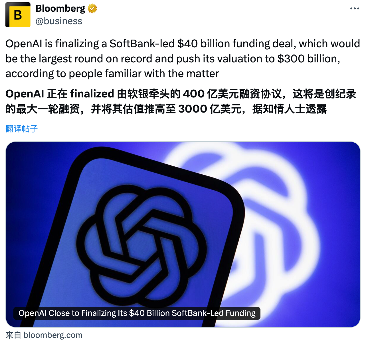 OpenAI 将完成 400 亿美元融资:软银领投、估值 3000 亿美元